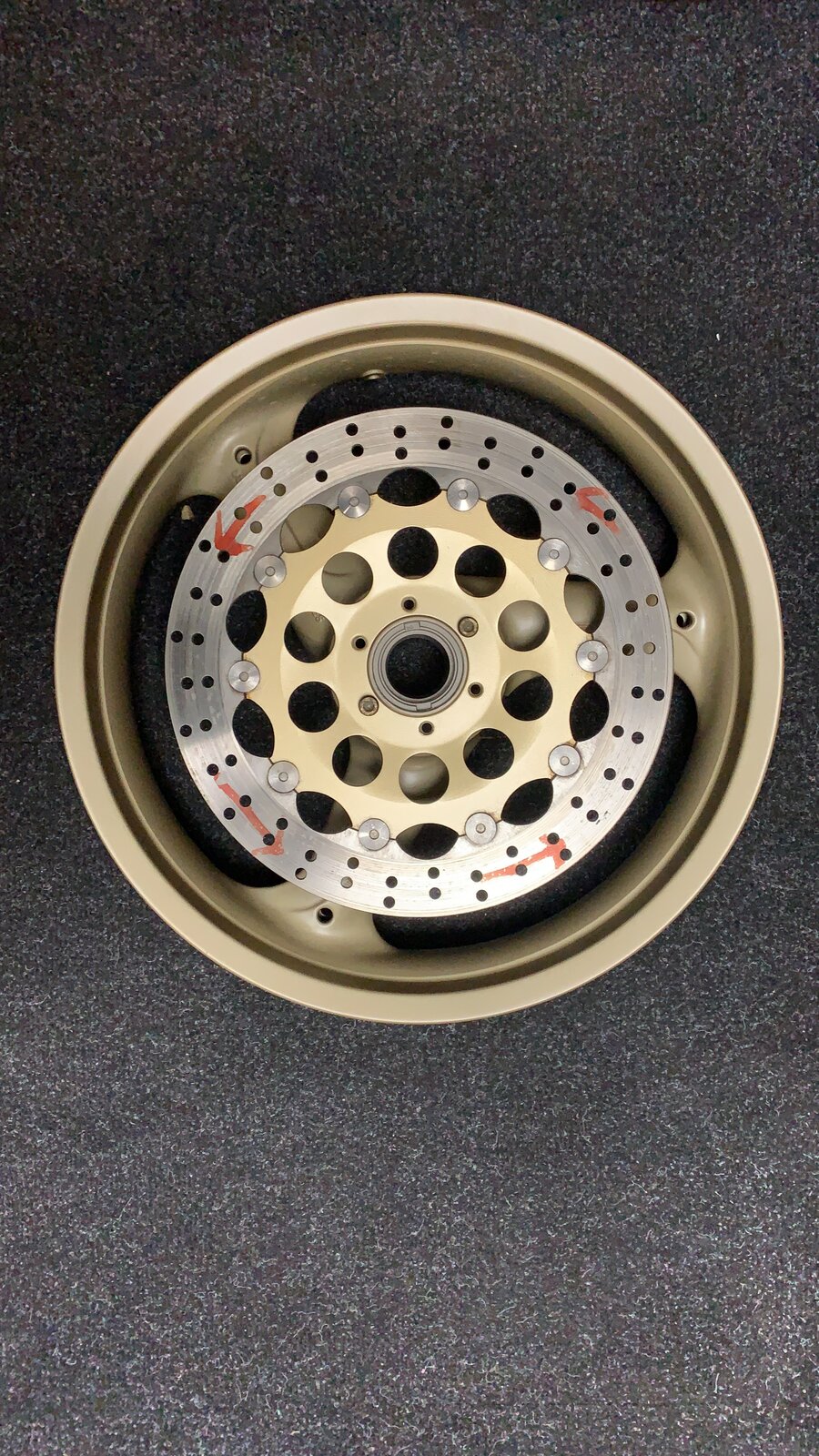 Front wheel coated yesterday, cleaned the disks up. Bearings should arrive Monday, just waiting on rear wheel to arrive now