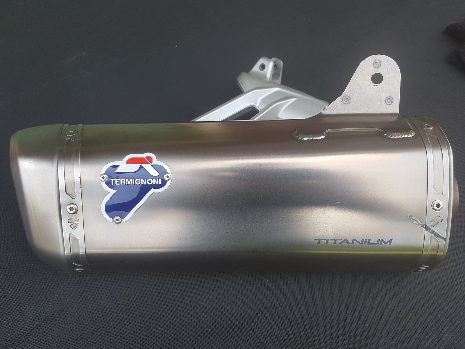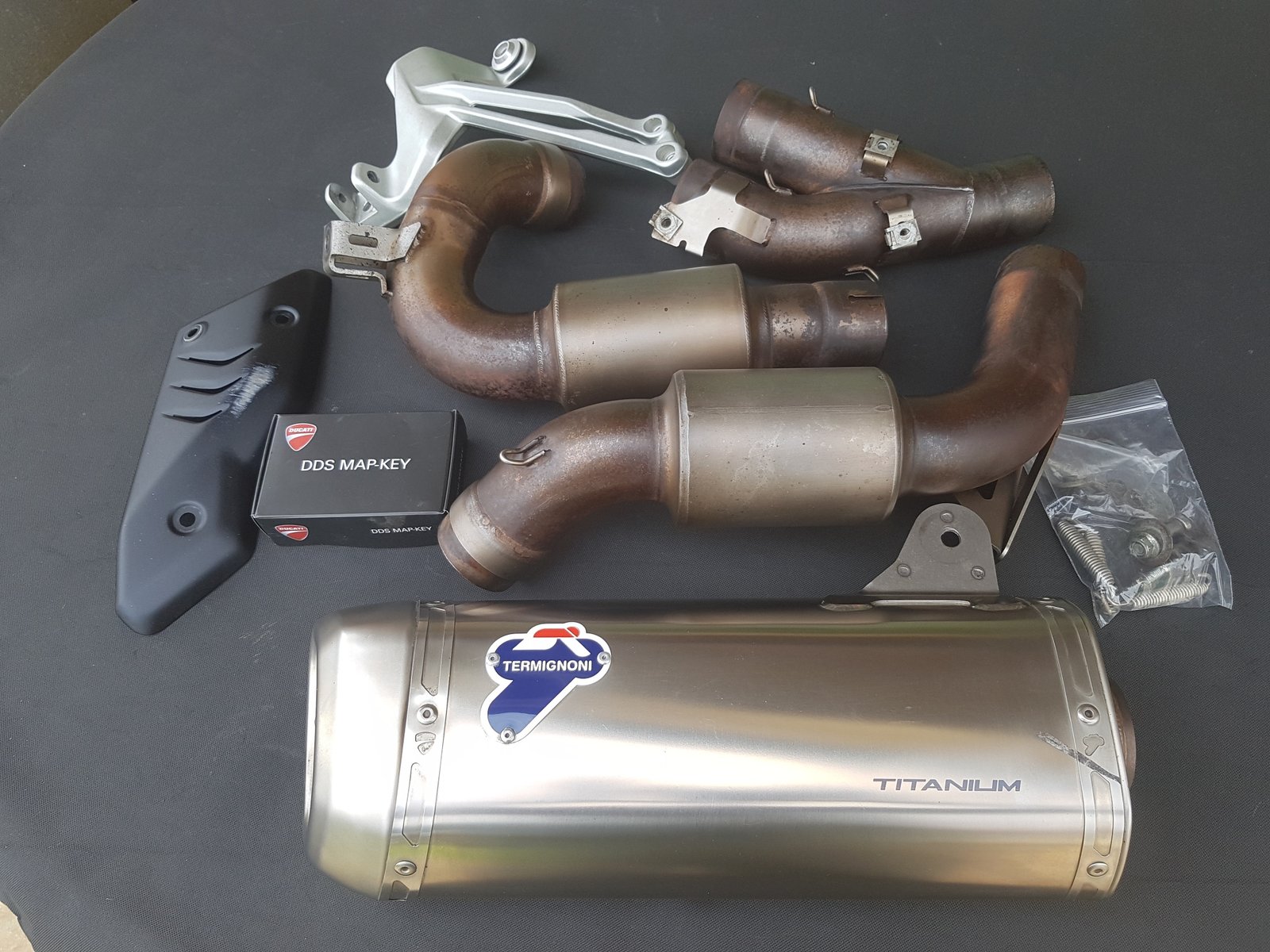 15. Recently removed from my MY2016 Multistrada DVT, I now have a full Termignoni exhaust system available, suitable for all Multistrada 1200 DVT models, comes complete with upmap key which will need to be installed by your Ducati dealer, usually takes about 30 mins to reflash. Exhaust fitting instructions supplied, easy enough to fit and only takes a couple of hours. The end can has a minor rub mark, as can be seen in the photos, this is not visible when fitted, if you have the pannier lower bracket installed.