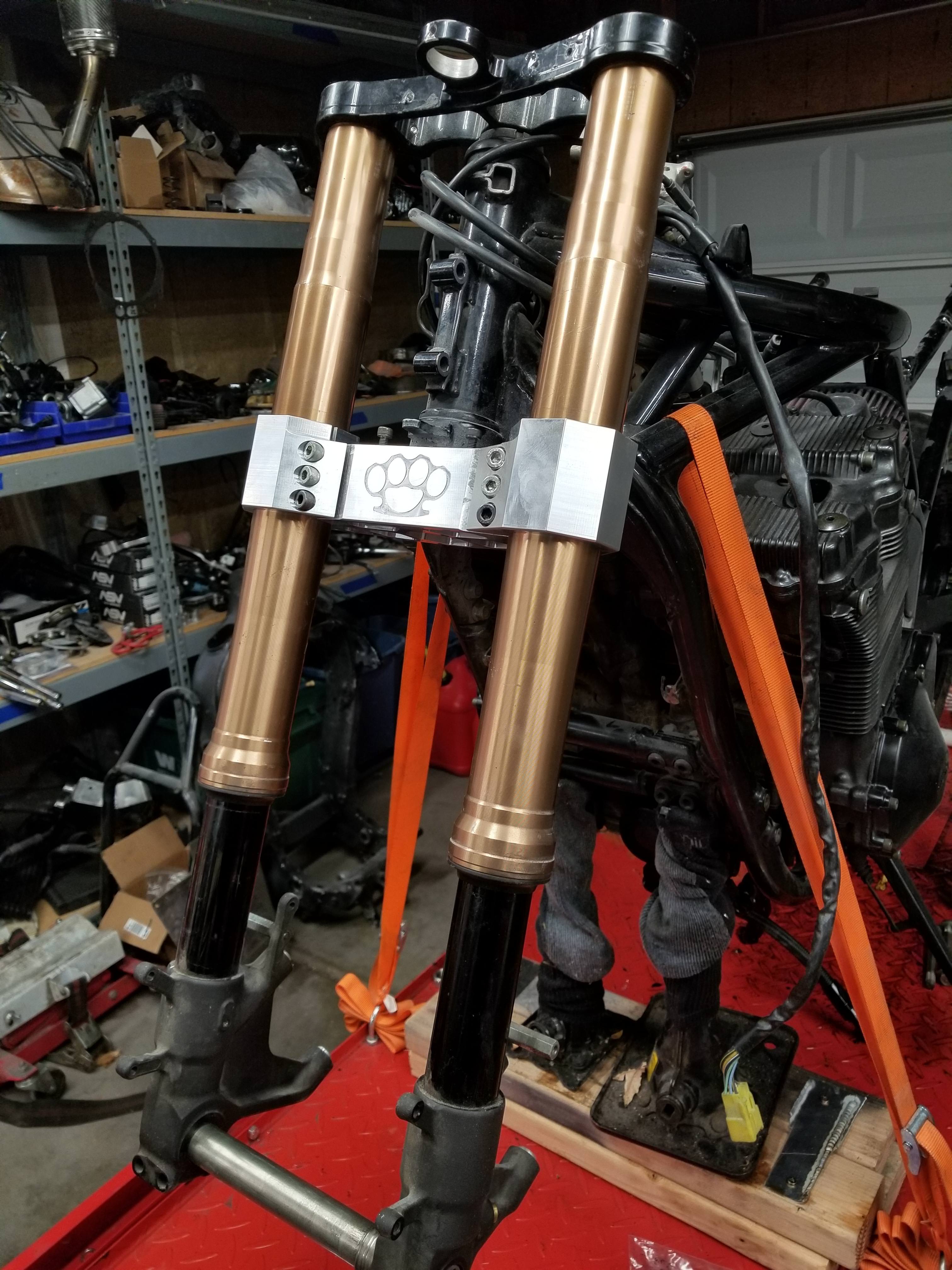 You lot seem to like pics. Here's another shot of the Hyper... Really not a fan of the OEM beak, so I'm making a number plate for it. Still have to whip up a mount for it and weld on the little hood for the light, and paint-fill the border of the Duc shield... Did I mention I got the Hyper for $500? Some of my other stuff, non-Duc: Bandit 1200 I'm working on... Bit left to do on it still... have to finish up the carbon bodywork, chop off and redo the subframe, bit of exhaust work, and I still have to finish up the top triple and the clipons. Finished out the lower triple a few weeks ago though, letting me mount a set of Busa forks/brakes/wheels... And speaking of Busa's. Here's my so-far-biggest project. It's at the dyno right now, making a little under 400hp at the wheel... Also have an R1 under construction, and a CBR900RR I'm parting out (er, breaking as you call it?), but those are too ugly for pics at the moment. I might be picking up another HYM1100S from a buddy for a turbo build, and I really have an itch to get a Pani like I mentioned. Bikes are always coming and going in my garage. Wife says I have a problem