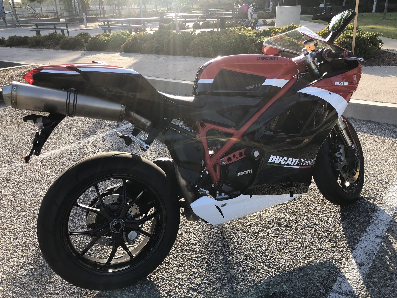 Finally have the bike! I have put about 160km on the bike this past weekend driving up and down the coast looking for an open road. I think everyone in Los Angeles was doing the same thing. The battery was delivered with a dead cell. It would just barely turn over and once it had an issue turning the exhaust valve. Simple fix, new battery. Also, I knew the rear spring was much stiffer than what was good for me but I could hardly get the Öhlins shock to move at all so I dropped the bike off at Motorsport Exotica this morning for a new spring and a shock rebuild, the front Öhlins were good. Here are some pictures, sorry I did not include my trash bin. I will promptly get on that next week when I get her back!