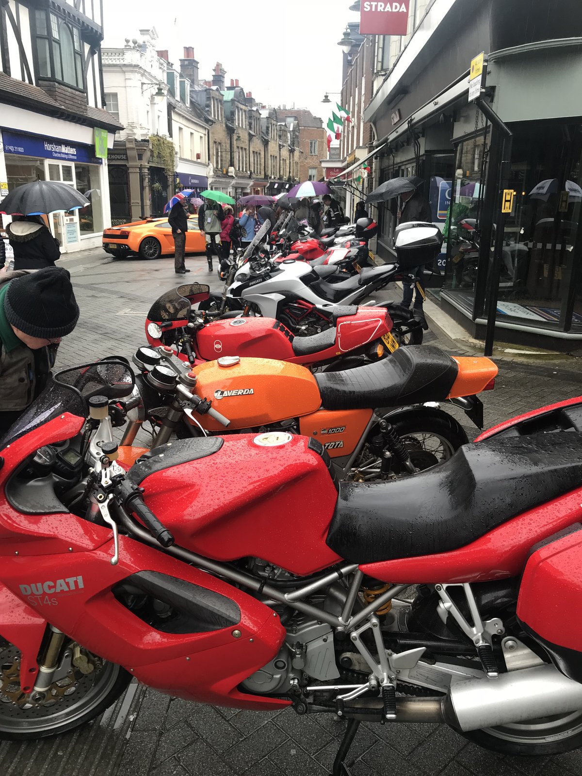 I was there with Panigale FE and 2017 Monster but decided not to run the Panigale in the parade. 1.1 miles on the odometer and wet cobbled street was too much of a gamble. Sorry I couldn’t sort the bins in the background.