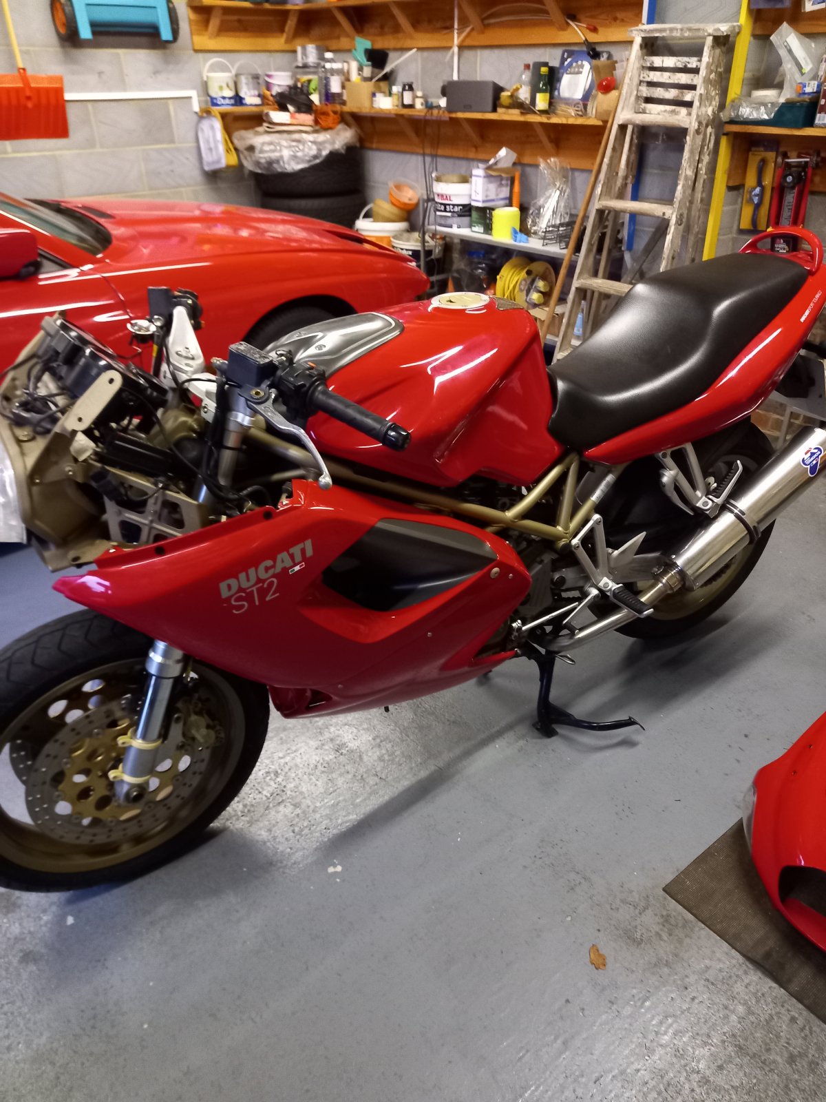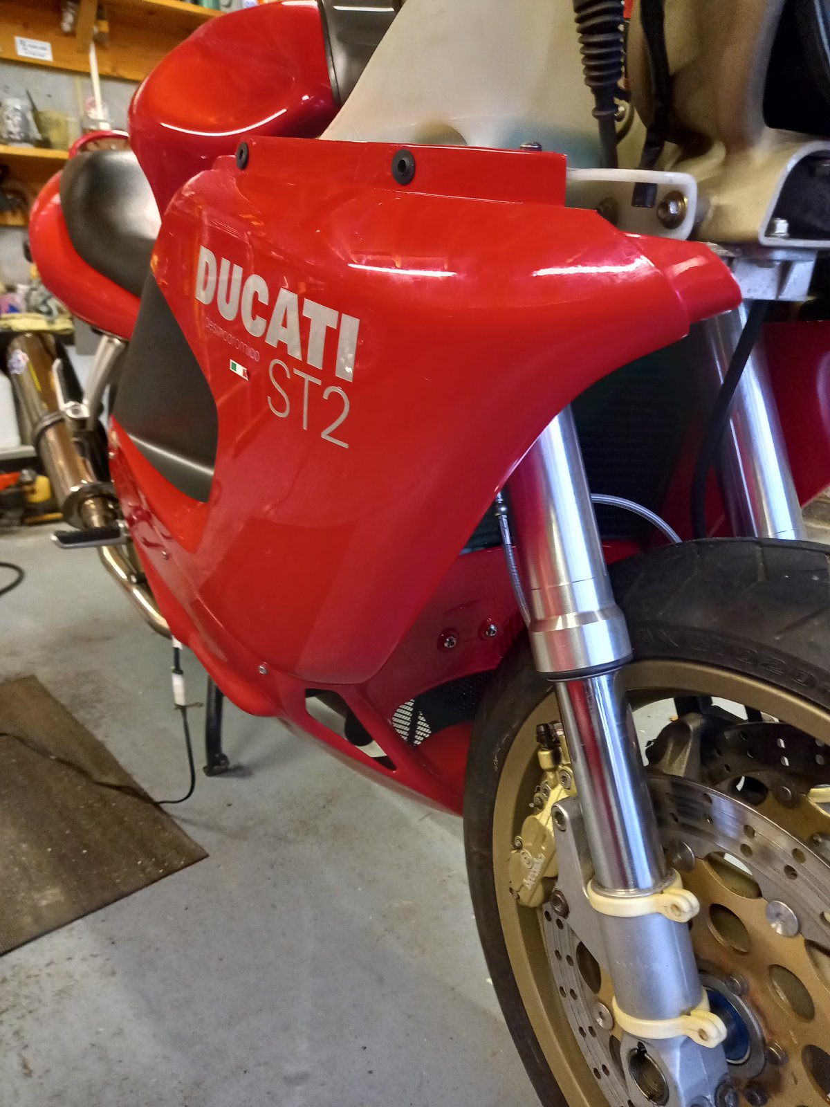 The ST range are notorious for how difficult it is to remove the bodywork, even to do something which should be simple such as access the battery. There is a file out there in the internet somewhere which shows how the bolts can be replaced with Dzus fastners which speeds the process up in the future and means the side panels can be removed without having to remove the mirrors and nose fairing. If I tag @Derek I think he shared it before.