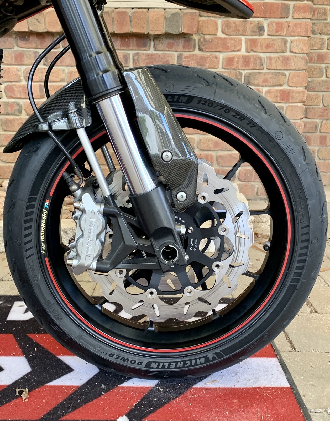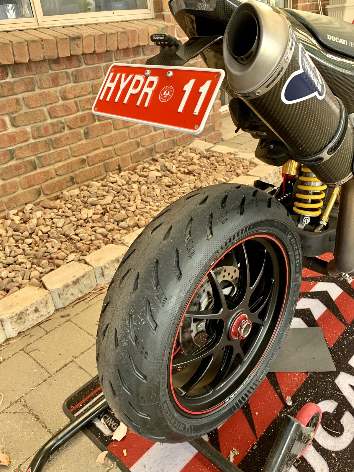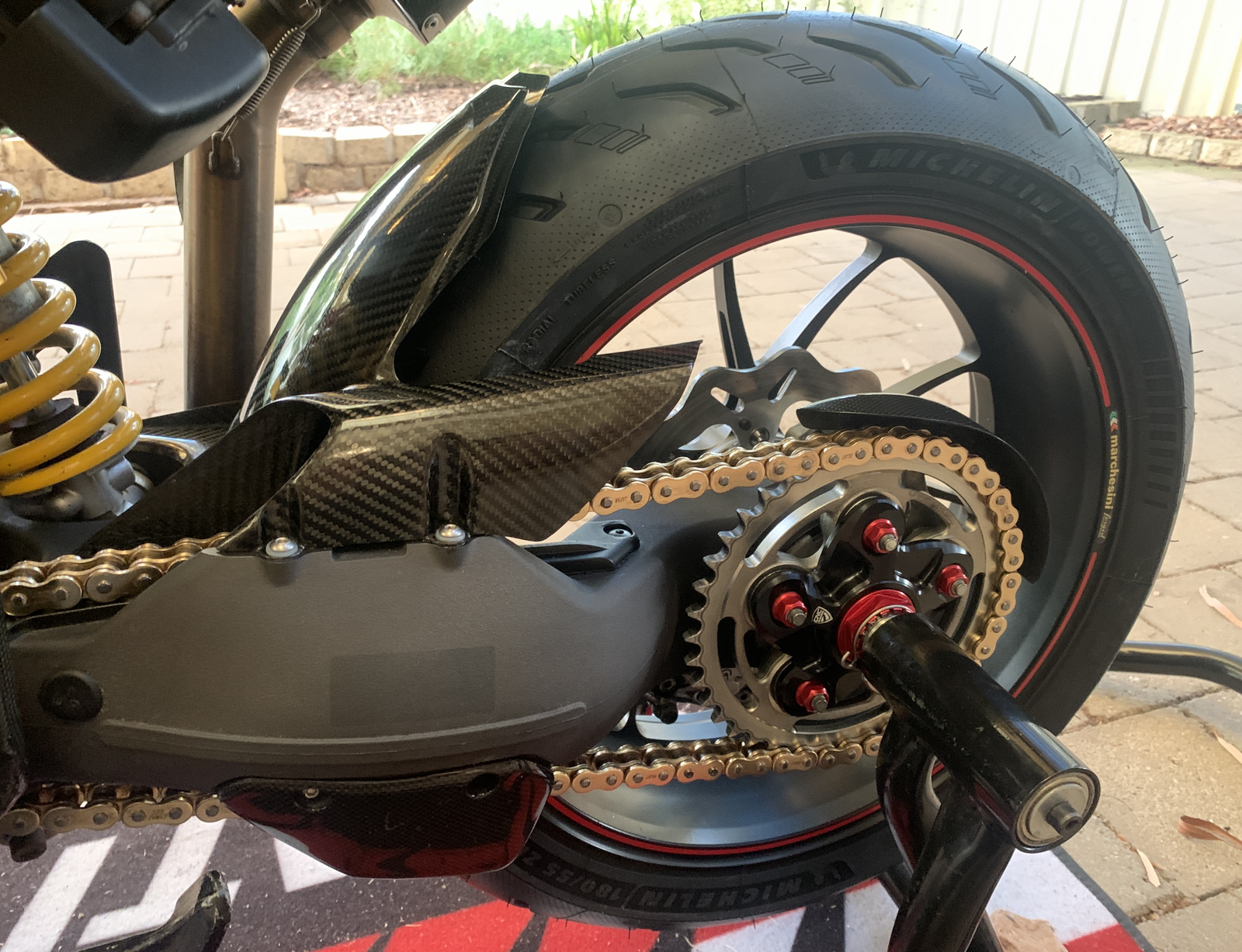 Think I've finished with blinging it up, for now .............. Gold chain, and a carbon hugger a friend removed from a Multistrada 1000 he is about to sell. Oh, and a new 'new' tyre