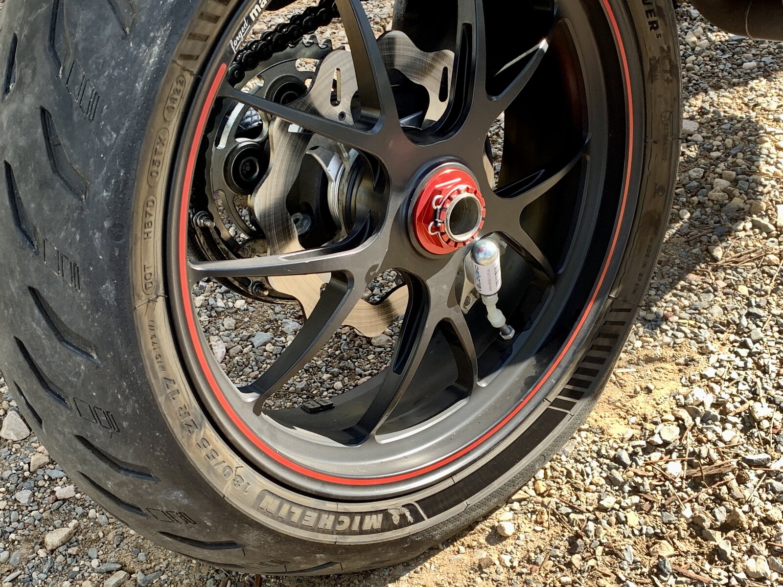 Carrying on re the new wheels I had new tyres fitted to them yesterday - the tyres on the rims were ancient and felt like rock so had to go before I intended riding it again, (in fact on the short ride home last Saturday after fitting the wheels the front let go even whilst taking it steady, got my attention in a hurry!) Could have swapped the Bridgey S22's from the other wheels but decided to go with new - for the first time ever I went with Michelin's, following my suppler/fitters recommendation a Power 5 rear and Power GP front.