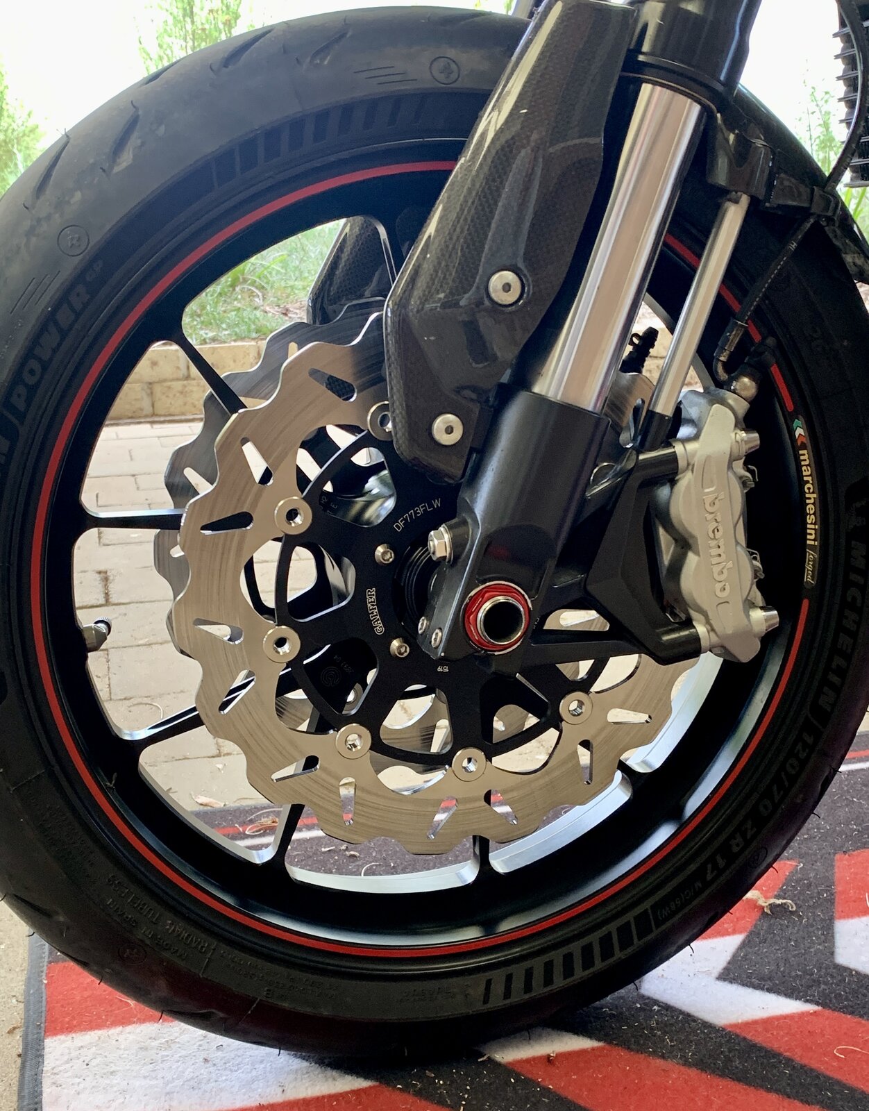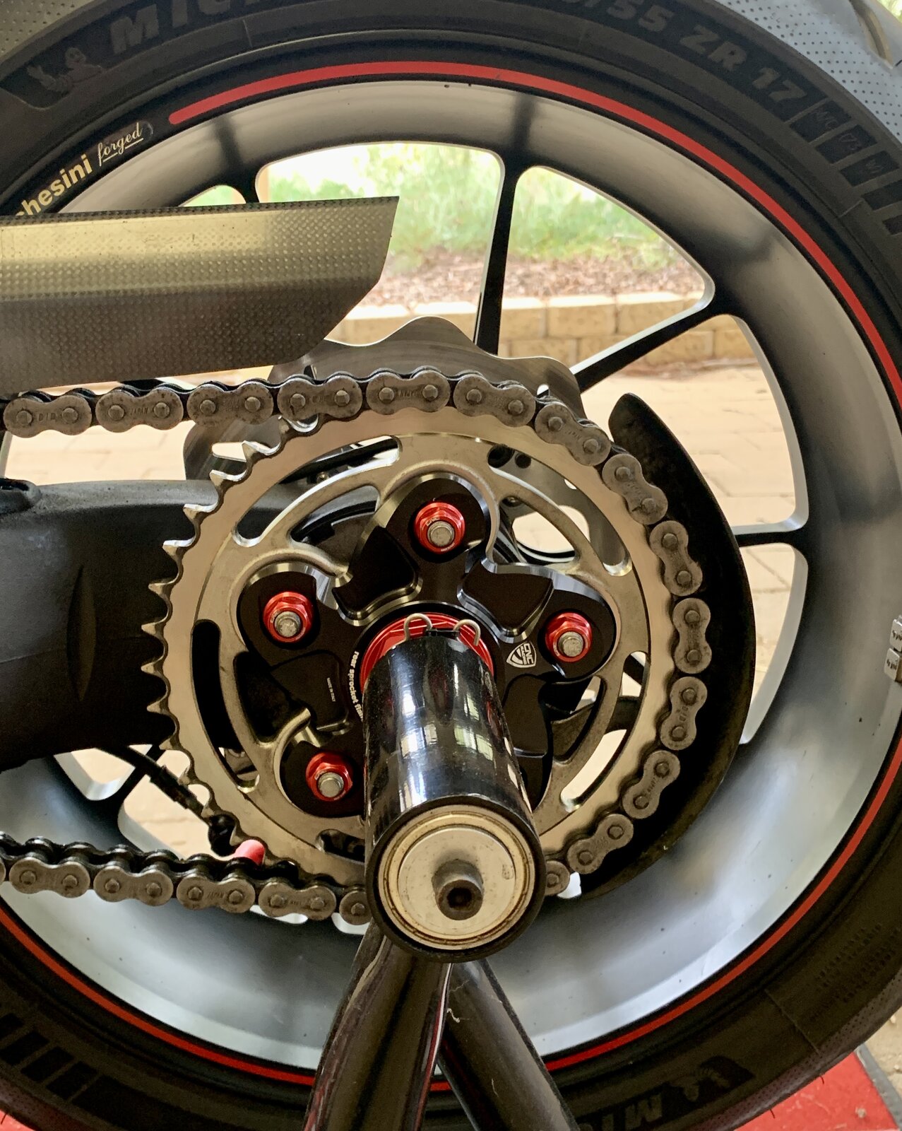 A tarting-up/personalisation day for mine today. Galfer discs F/R, CNC Racing wheel nuts, CNC Racing sprocket flange and nuts, a few titanium bolts here and there.