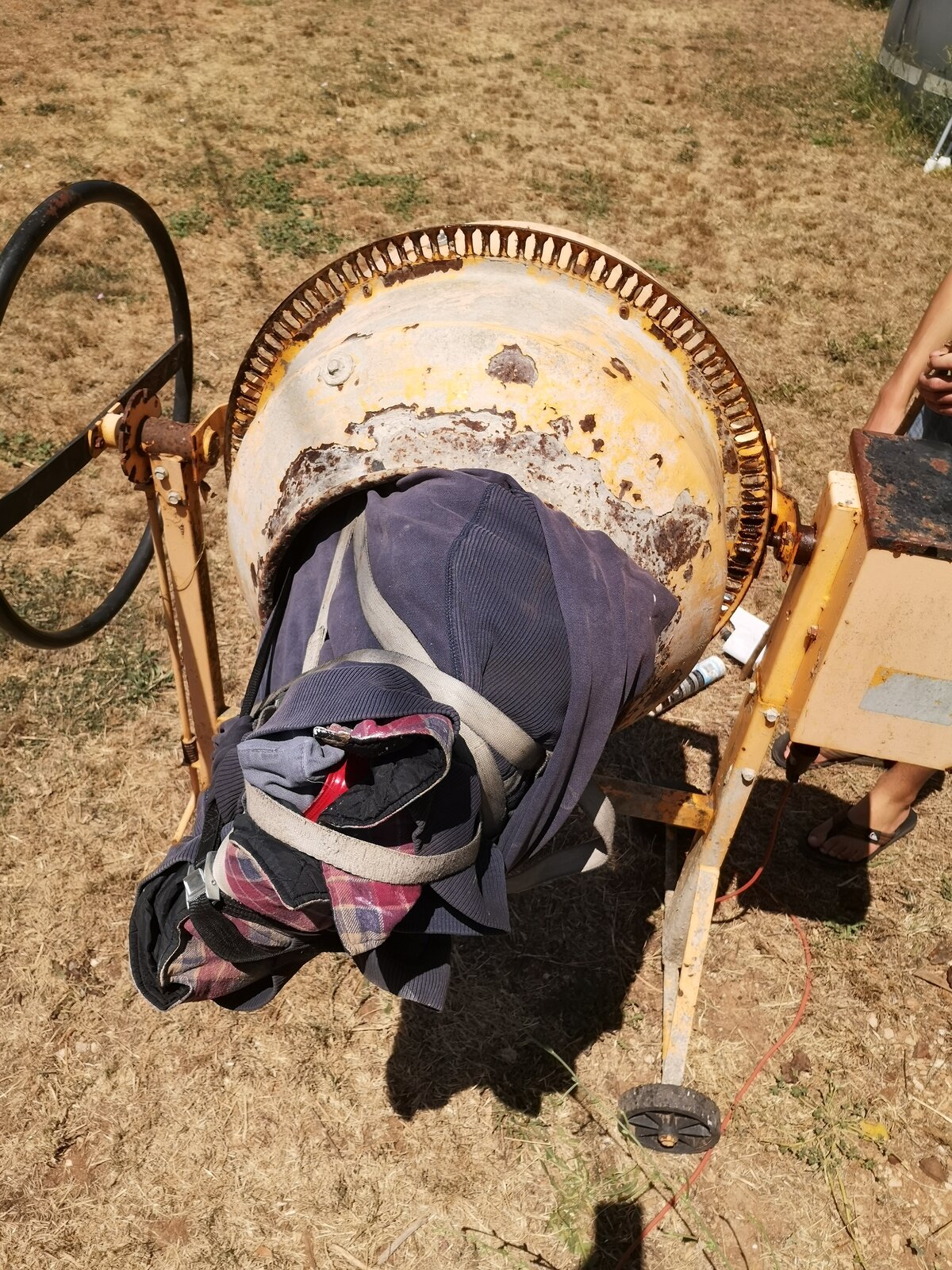 For a slightly humorous tryout... I made a plate that would seal the top cap hole. Collected some chunky gravel from the garden to put inside... Found some thick jumpers to wrap around the tank And then chucked it in the cement mixer for half an hour... (actually carefully strapped it in place )
