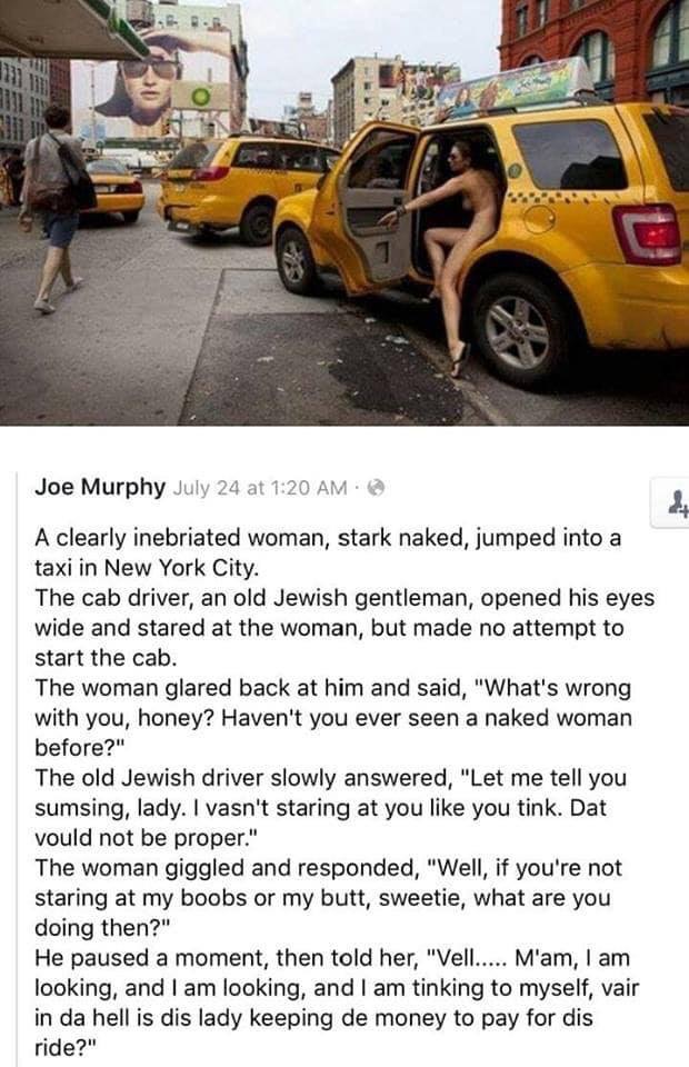 My mate Dave and his wife were struggling to make ends meet financially so after a lot of thought they eventually decided that the easiest way to make a bit of extra money was if she went "on the game". Anyway being a bit naive and not worldly wise she wasn't quite sure what to do, so Dave said to her 'Go and stand outside that pub and pick up any guy that looks like he might be interested in doing business. When he asks 'how much?' tell him it's a £100. If you’ve got any questions, I’ll be parked around the corner." After about five minutes a guy sidled up to Dave's wife and said "How much for business?". "£100" replied Dave's wife. "Bugger, all I’ve got is £30" explained the guy. "Hold on" she says and runs round the corner to Dave who was sat in his car. "What can he get for £30?" she asks Dave. "For £30 you can give him a hand job" Dave replies. She runs back to the guy and tells him that all he gets for £30 is a hand job. "Okay" he says "get in the car" As she gets in his car, he unzipped his trousers, and out popped his penis..........and it was HUGE!. Dave's wife stared at it for a minute, and then said to the guy "Hang on, I’ll be right back." She then ran back around the corner to Dave and said breathlessly, "Dave, can you lend this guy £70 please?"