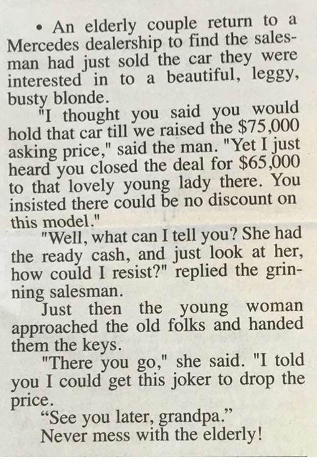 Two elderly women were driving in a large car. Both could barely see over the dashboard. As they were cruising along, they came to a major junction. The traffic light was red but they just went on through. The woman in the passenger seat thought to herself, "I must be losing it. I could have sworn we just went through a red light. After a few more minutes they came to another junction, the light was red, and again they went through.This time, the passenger was almost sure the light had been red, but was also concerned that she might be seeing things. She was getting nervous and decided to pay very close attention. At the next intersection, sure enough, the light was definitely red and they shot right through it. She turned to the other woman and said, "Mildred! Did you know you've gone through three red lights in a row? You could have killed us." Mildred turned to her and said, "Oh shit! Am I driving?"