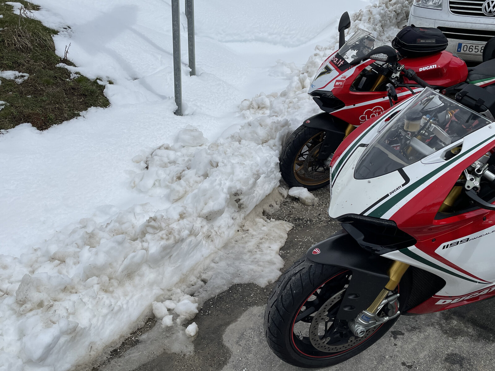 Noises Off. On Sunday at the top of the Picos it was deep snow. The roads were clear, going up was good but going down wasn’t so good. Lots of melt water cascading off the rocks and wet roads. At one point we had to ride through a waterfall which couldn’t be avoided because off a cyclist coming up the other way. The bikes got pretty filthy. The temperature had dropped pretty low, I’m not sure exactly probably only a couple of degrees but later as we descended I clicked over on the screen and we were up to 9 degrees. As we headed across the boring but unavoidable plane it clicked up to ten then eleven degrees. We both put rain jackets on to keep warm which took me up to five layers plus the jacket liner. Quite where I’m going to put it all when I strip down to just the jacket and a T shirt I just don’t know. At least they’re thin crushable layers. Heading towards Palencia on impulse I decided to take a left and go into a village for refreshments. A sleepy little place with a scruffy little bar on the square. Four fella’s were sat outside drinking and shouting at one another. We went inside and it was mayhem. There on the wall was a mahousive TV screen showing the last two laps of the Portuguese MotoGp, live. There were only half a dozen people in there but they were shouting and hollering for Marquez, didn’t matter about Quateraro winning, all that mattered was Marquez coming in 7th. We stopped dead in our tracks and watched the last couple of laps. No point trying to order. Race over, we discovered there was no food of any kind, just drinks. Oh! So we had a decaf and a Sin Alcohol cerveza, outside. The whole time we were out there we could hear the mayhem inside. As I left after going back inside to pay the young girl making most of the noise shouted, “Adiós señor Ducati”. “Ha, adiós”. And they all piled outside to watch us go making a twistgrip sign with their hands demanding we rev the bikes, hilarious. I obliged by giving it a good blip to keep them happy but of course, what they wanted was for me to bump it off the Rev Limiter, which was just not going to happen. A minute later we cleared the village and I wound it up through the Quickshifter to give them something to listen to. As Baz said, by then they were probably back inside making far more noise.