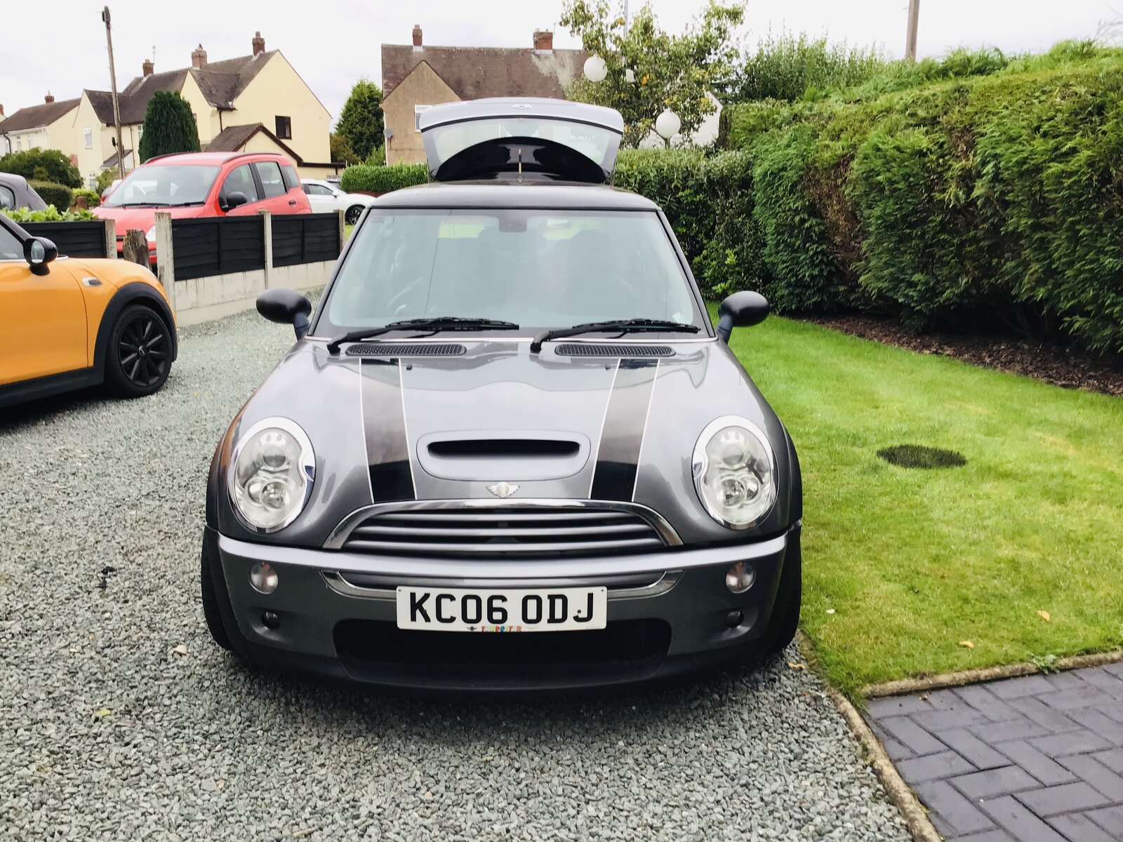 Long gone and apparently taken back to standard by the new owner, no no more popping and banging on the overrun for him/her. The Wolves Mini belongs to the neighbour and neighbour on the other side has a Silver Grey r56 too.