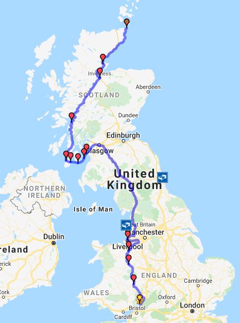 There is no motorway use before Liverpool. I go west of the M5 but don't go into Wales until the very top. I could go further west and start from South Wales.