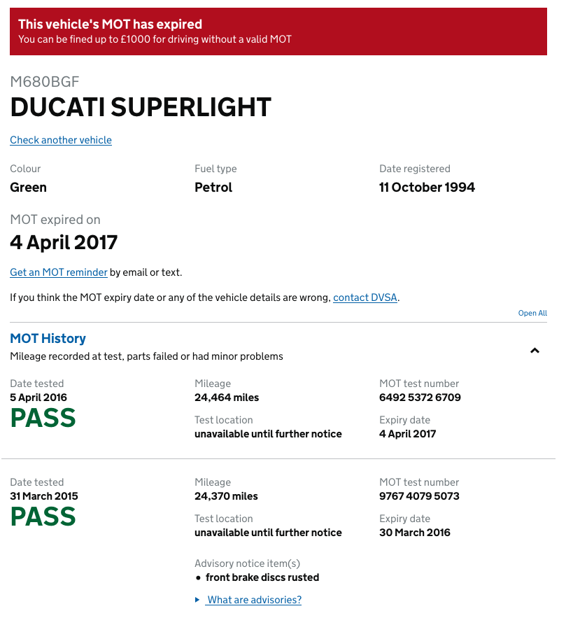 DVLA are showing it as taxed, but MOT expired in April 2017 It's been passing it's MOT's and is still green Good luck finding it.
