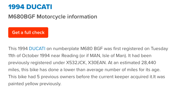 So it was yellow and has had 2 other registration plates in it's time... last owner change in March 2011. https://cazana.com/uk/car/M680BGF