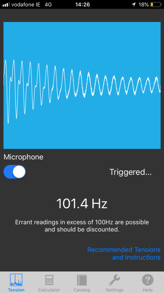 Try as hard as I could I just couldn't hit the optimum 99Hz when tensioning so I've settled for 101Hz. I reckon a couple of Hz is neither here nor there.