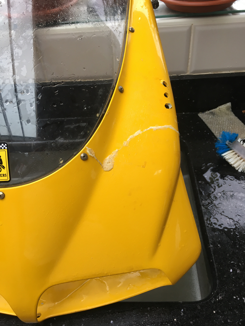 While the cat's away the mice will play. The wife's out today so I sneaked the nose fairing into the kitchen to give it a good wash and remove the bandages. Before @Birdie and told me about the QBond (which I now have) and @comfysofa had told me about the hot stapler (which I haven't bought yet because it's €118, money which would go a long way towards a replacement nose fairing or a professional fix and respray), I used Gorilla Glue. It seems to have done the job but I'll find out how strong the repair really is once the fairing's back on. If it breaks I'll try the QBond next.