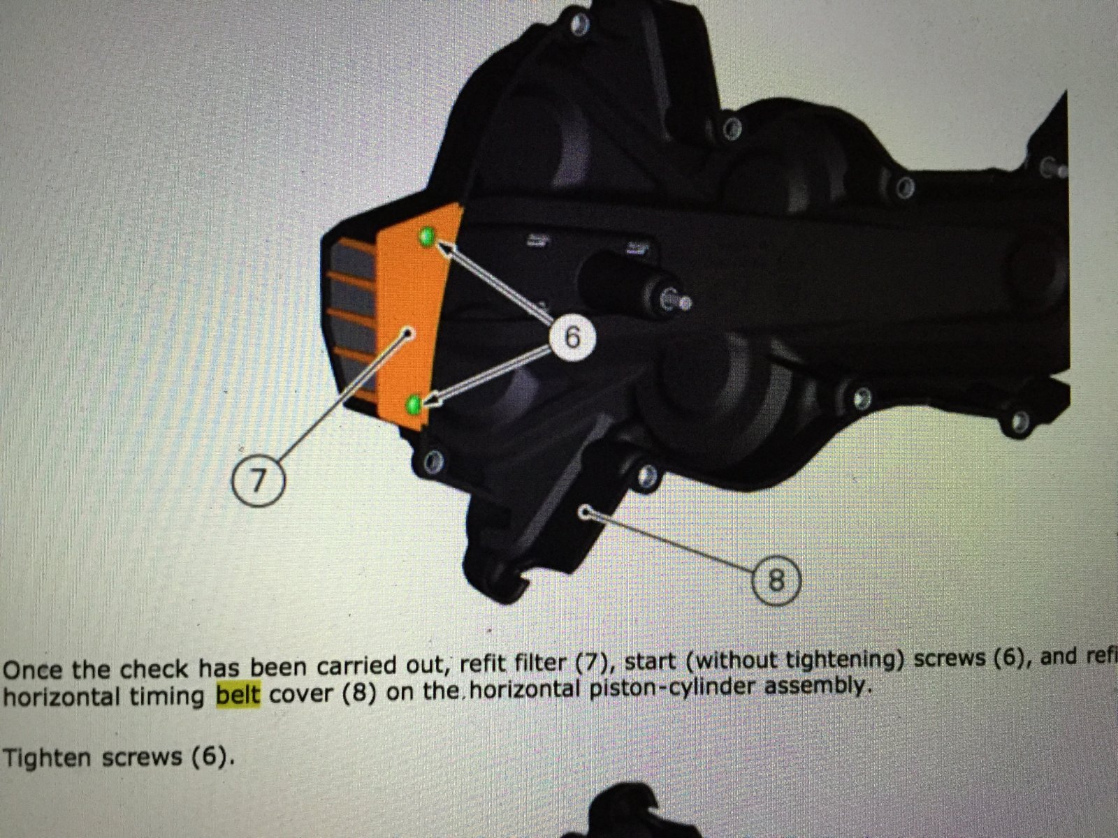 Hi 1. Unscrew all screws. 2.(3rd picture) Take off rubber breather hose,(located far up from the left cylinder) just loose the connector from left and slide the rubber hose over right, it its tight.there are some cables with zipties, take ziptie off you need all the space. 3.(1st picture)Take off cambelt cover filter from old part and install it to the carbonfibre cover. 4. (2nd picture)Just install the new part, remember the tighten sequence. (min 9nm- max 11nm) It is quite easy to do with 2 people. 1 person is pulling these cables and other one will install the part.