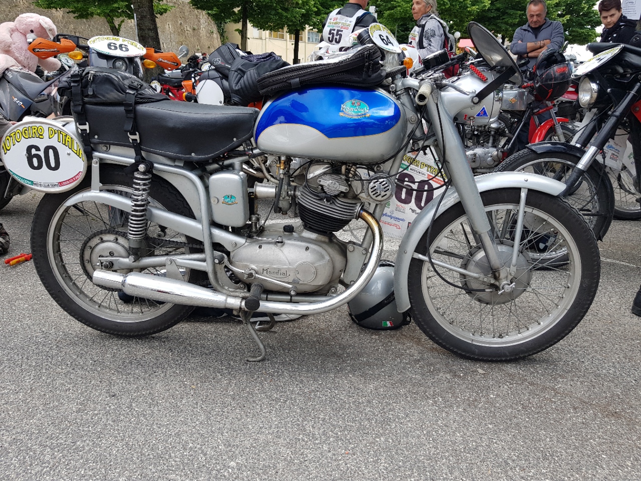 General scene at a time check: This beautifully made Mondiale was being ridden in a spirited manner. You can just see a lady with a Ducati 160 Monza Junior: This Indian was in fine original condition: This was a line up at the Finish, in the Roman amphitheatre in Tivoli: