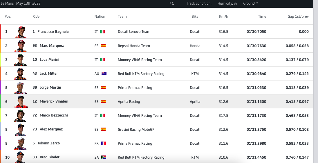 Did someone pass on my last comments to MM93? He certainly surprised me there in Q2, I just hope he doesn't cause carnage in the Sprint race this afternoon. Another master class ride by Pecco and Luca Marini too, but if Jack Miller makes his usual lightning fast starts he'll definitely be in with a podium chance.