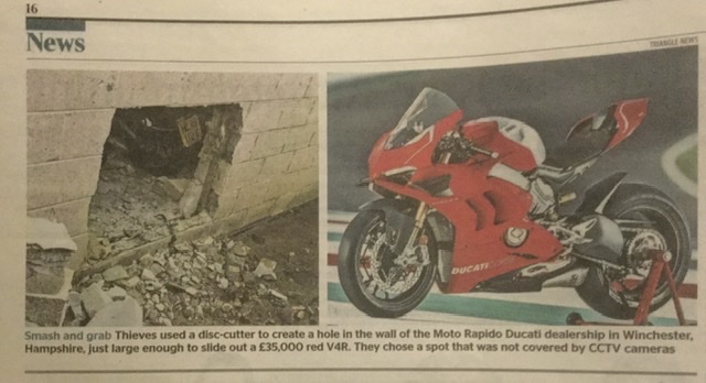 Seems it’s a common theft ploy, and size is based on risk of collapse and big enough for a bike. Apparently last week there was a desmo in the spot where the v4r was this week.. Reading posts, no point in tracking down anyone as police have zero interest