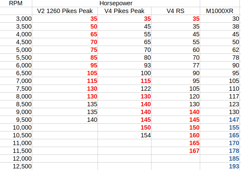2. I have to agree here. I'm a Ducati guy but I also have to be realistic. The BMW has a weight advantage and a dyno measured 26hp power advantage (193hp vs 167hp against the RS).Moreover, I'm 100% sure the M engine with its Shift Cam technology is a match for the RS with yet to be published torque numbers. Vegas odds on this bet would favors the Beemer. If we favor the Multi RS, it would have to be about other features.