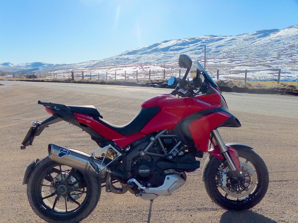 OK...so here's how my brand new 2013 PP was ridden from my pal ' Wudz ' showroom and gently baptised in a slightly snowy N Wales late March.....it's now waiting to fit a little more lighting 'cos I'm scared of the dark and then it will be fit for all challenges. Standard Ducati spots below rad and a pair of high level amazing Vision X Solstice Solo Spot 10 degrees. Plus a Nautilus MSX 139dB horn to clear those Hitlers Bike Bavtracs out of the way while hunting down and passing the odd new KTM 1190 Adventure in the bumpy B road twisties. With full titanium pipes, 'chip' and Termi it sounds awesome and breathes so well in mid range. To run it in before first service I've done some mixed, fast roads ( with no time to stop and take pictures...Fogump is my name....and " running/riding faster than the wind..." is my game...:biggrin: ). Next is IoM pre-TT week for some serious laps of that mind blowing circuit and a few light IoM trails ( not that many tho' as most are rocky and some big steps...not so good for those Marchesinis... ). Then I guess I'd betta start thinking about another set of rubber...and Ducati panniers for some serious GT rides. This 'bike's a player...! ...OLLI....