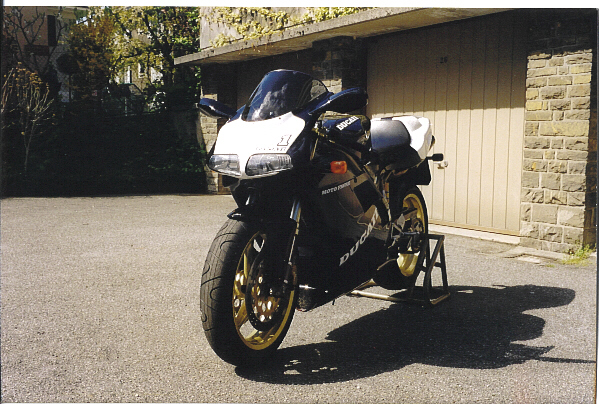 There's a small story about this pic. My red 916 was bog standard until, shortly after having been run in, it went for a service. When he was testing it afterwards for a shake-down run, my garagiste crashed it. He offered me a new one for CHF 1000 as a replacement, or that he would make my one "better than new" with my choice of paint. I chose the latter option, as I didn't want to hand out another CHF 1000, and didn't want to run in another bike. So I ended up with a 916 in this Chili-esq paint scheme. Mine was originally No. 8, because my garagiste had cut up an 851 sticker. Then a few years later, my 916 was stolen at the Bol d'Or. By a happy coincidence, the guy who had No. 1, which was almost identical to mine, was selling it. It had quite a few less kilometres on it than mine, but the insurance money covered the cost entirely. So I ended up with No 1, which is what you see in this picture. The only thing I lost out on was that I had just fitted cast iron discs on No. 8, which No. 1 didn't have. Can't remember if I fitted more, but I don't think I did. I don't know who had No. 5, but I think my garagiste put that on his track bike.