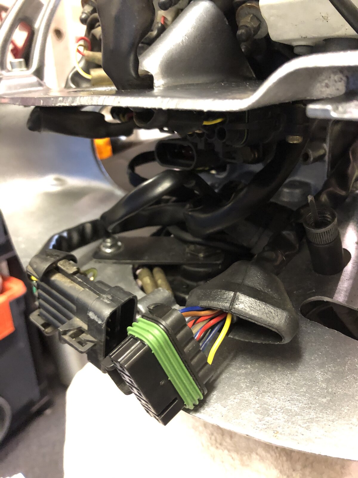 Bob, did you replace the boot on the atmospheric pressure sensor on the rhs of the header tank by the steering damper. That one allows water into the sensor connector when the rubber is perished and the water will sit around the connector pins causing odd running and cutting out issues particularly when it is hot. The reason it is turned back on itself and then tied that way is it is a known issue. Separate the plug and have a look in the socket and you will see where the water sits.