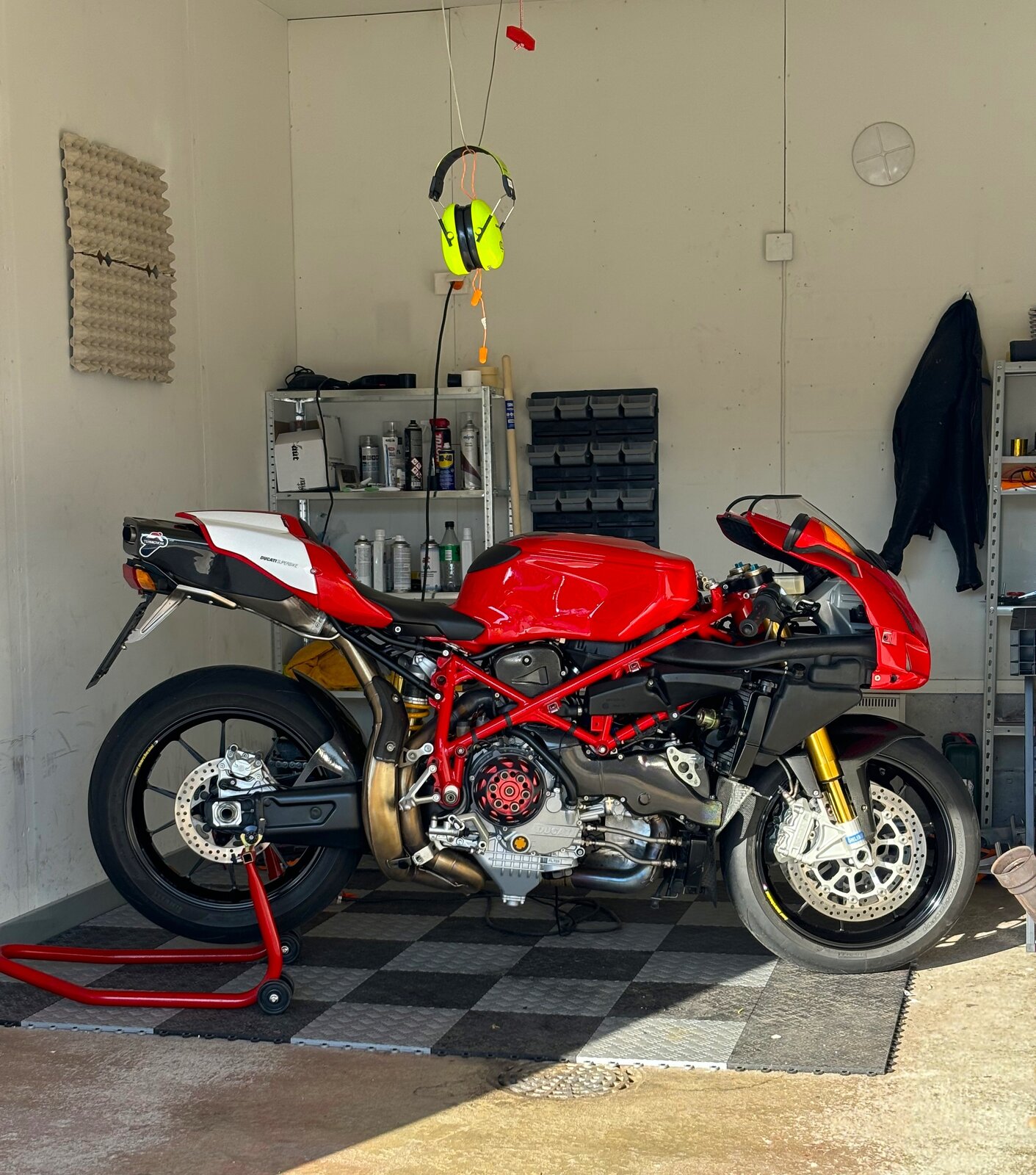 After long search I found this bike at May of 2023. Bike was in a bit bad shape but I decided that it's now or never to have my dream bike. I decided to build whole bike again from scratch. Amount of spent money is ridiculous but it was also a lot of fun! Here some bits what has been done; - All bearings, seals and worn out parts new to engine - Valve checks, new belts etc.. - All engine cases vapor blasted and coated with powder coat - all carbon fairings painted with original color - Front suspension service - Termignoni 57mm exhaust - Ecu adjusted - Sprockets + chains - Some original ducati performance + cm composite carbon parts.. - Many parts blasted + powder coated.. Here everything starts; Taking engine out; Engine with a lot of corrosion; Some paint to blocks; Engine parts again together; Ducati back in shape again;