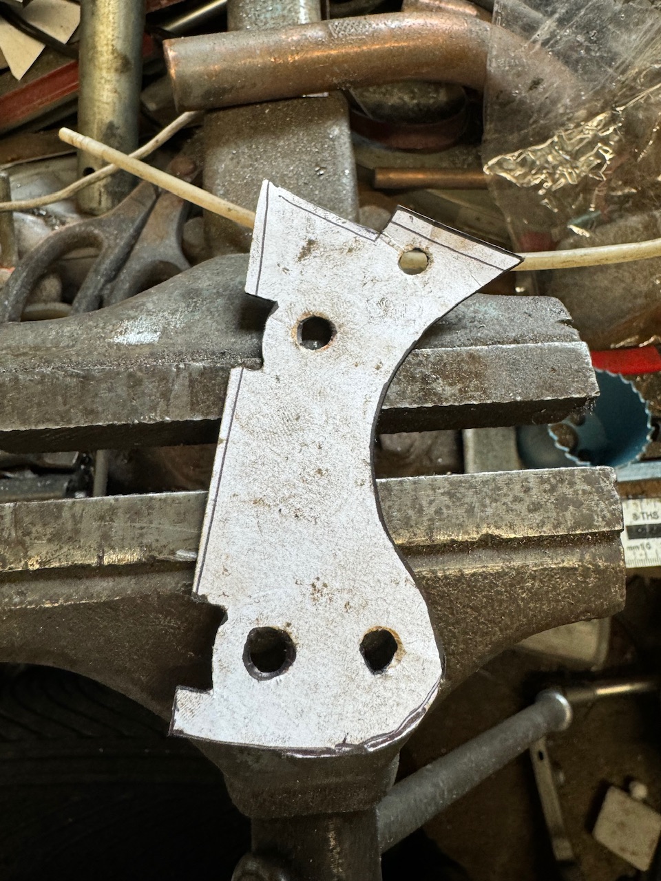 Thank you. That’s not a million miles from my 765mm. I’ve been in the garage all afternoon trying to make it fit. I didn’t realise u til I offered up everything and then fitted the ignition barrel, there is pretty much only one place it can go as the barrel is up top and my lock stops down low. I had to dress the subframe to clear the barrel too but I think I can get this to work. The sole purpose here was to avoid chopping up the original Blade so it can always go back to original if required, and I think this is about the best I can do. I just need to drill and tap two holes now and I can get my frame off to powder coat. Here’s what I got. I used a profile gauge to get the internal shape of the subframe then transferred it to cardboard then 10mm plate then used a plasma cutter and linisher to follow my template. I then had to linish about 3mm from the width of my mounting tabs to centralise the subframe which I’m not too concerned about as the mounts are still there should I ever need them. Tapped my adaptor plate 8mm to take countersunk bolts. These will be thread locked and torqued up. I still need to drill and tap the last two fixing holes to bolt it up solid. Clearance so tight. May need to relieve it a little still.