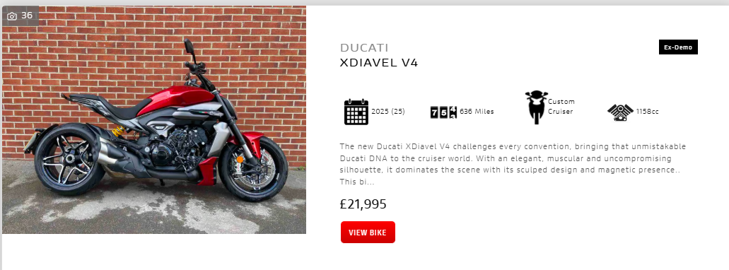 Although I have the money, I am not buying anything as there are some vicious people about in the Drivers Medical Group at the DVLA and I expect to be banned any minute. At the Doctor appointment, all seemed fine and that is what he told me that he would tell DVLA. Maybe, but I don't believe any medical professional after what I've been through. But anyway, I still look at the Riders website. Although I could afford it, I could never bring myself to spend over £20 grand on a bike. Am I in the minority here and just not up with the times? This is an ex-demo. And ex-demos, I am unsure about. It will of been looked after by professionals, but ridden (and abused) by anyone.