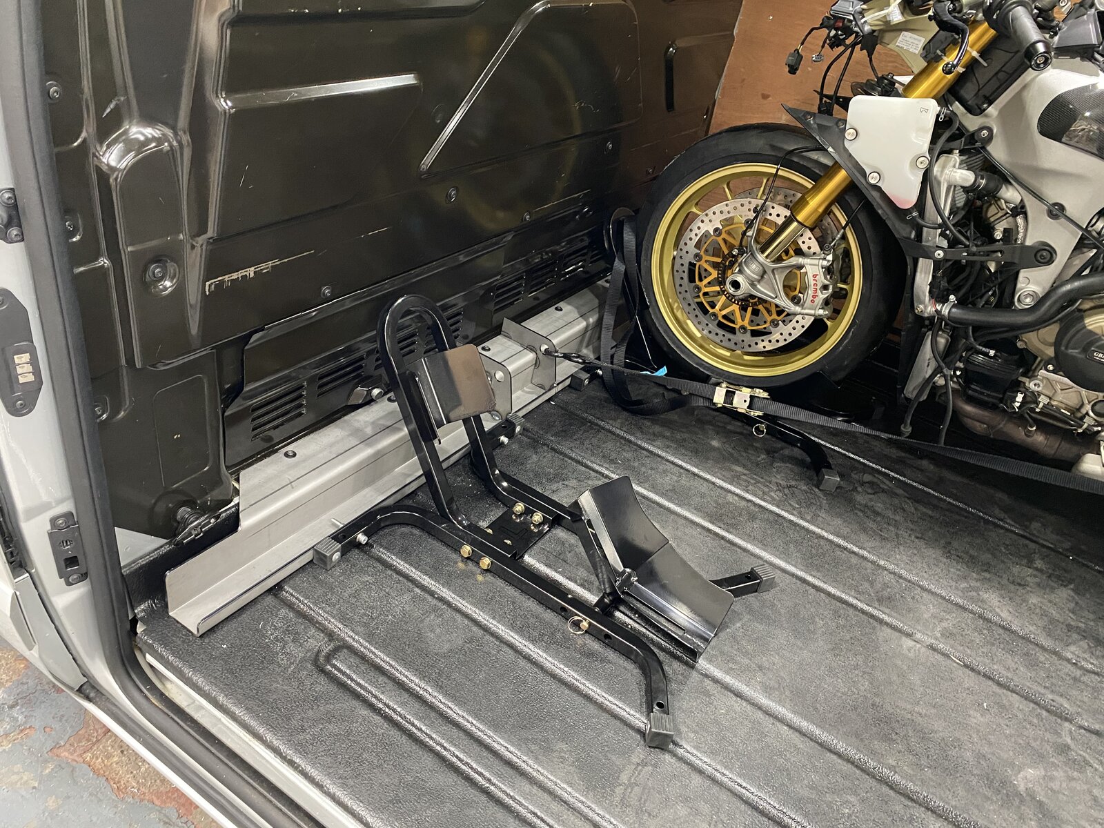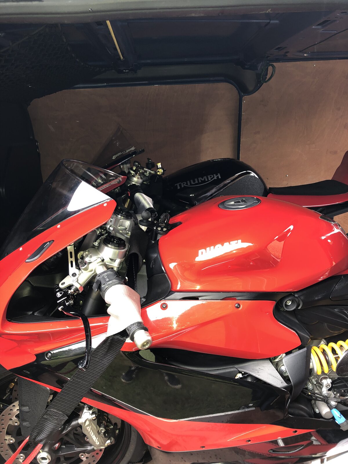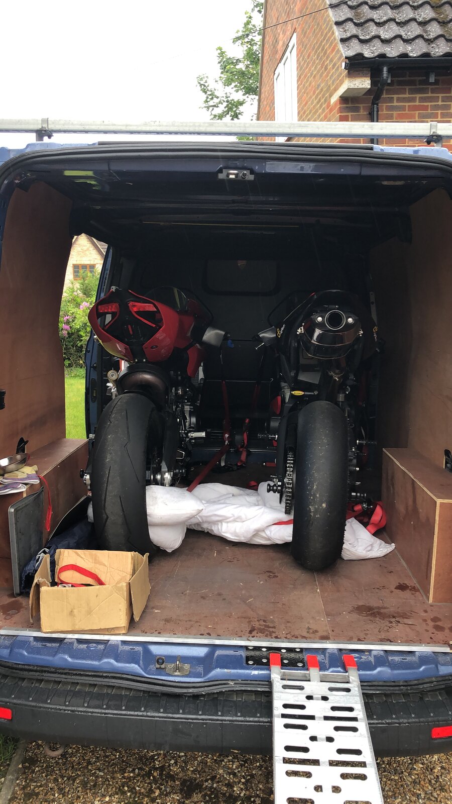 1. I've used @Freak Option 1 system on many occasions to good effect, either with 2 sports bikes or sportsbike and a Multistrada, albeit using a Trafic van. The only thing I do different is, I don't use paddock stands, I put both bikes on side stands with a block under to put them a bit more upright and leave in gear, both bikes on full left lock and use the steering locks if fitted, then ratchet strap them down as above.