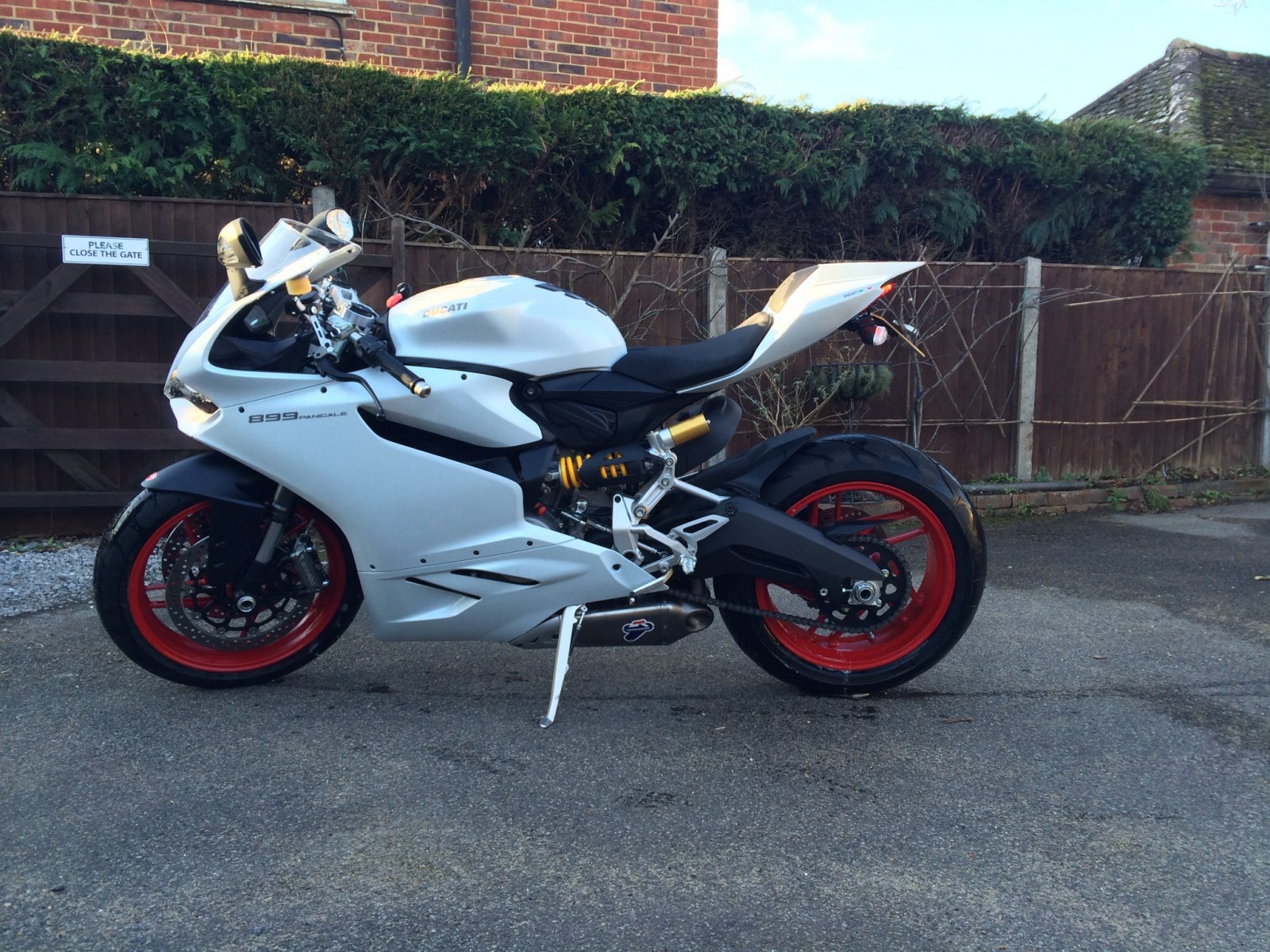 Hoping snow stays away and I can get out for a ride. 1199S with Termis, 899 seat, evotech TT, carbon heatshield/heel plates and Oberon pegs. Plus Ventureshield if your eyesight's really good. And a wheelie bin skulking in the corner