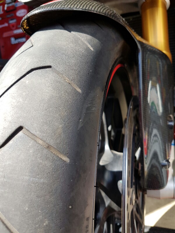 I've had the same issue with every Pirelli tyre I've used. The reason I think is the tread design as mine 'stepped' really badly after 700 miles and had a 'channel' in it off centre to the right like yours. To further qualify, this happened on my 848 from new with SuperCorsa's, it happened on my Daytona with the same tyre and then also with a replacement 'Diablo 3' at the time despite my suspension being re-valved and set up for me... and it happened on my 899 with the standard Diablo Corsa front Tyre. I'm 88kg, not particularly hard on the front, and infact in sorted it's self out a bit after a day usage on track. I always keep an eye on pressures but the guy in the tyre place said 'listen it's a pirelli thing, they all do it but they are good tyres'.... I've just switched to Dunlop Sportsmart 2'a as I had them on the 848 and my Daytona and did Scotland tours with no issues. I'm not slagging Pirelli off, they have good grip and feel but I do think they wear differently to others Sent from my iPhone using Tapatalk