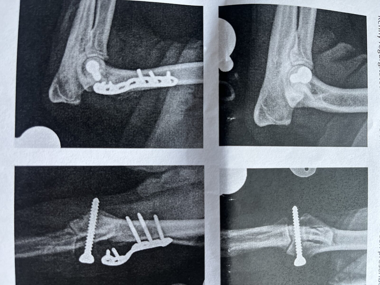 Hes doing "okay" i would say still really hesitatnt to put any weight on the broken one (its only been a week) and he still hasnt had a shit since he got home.