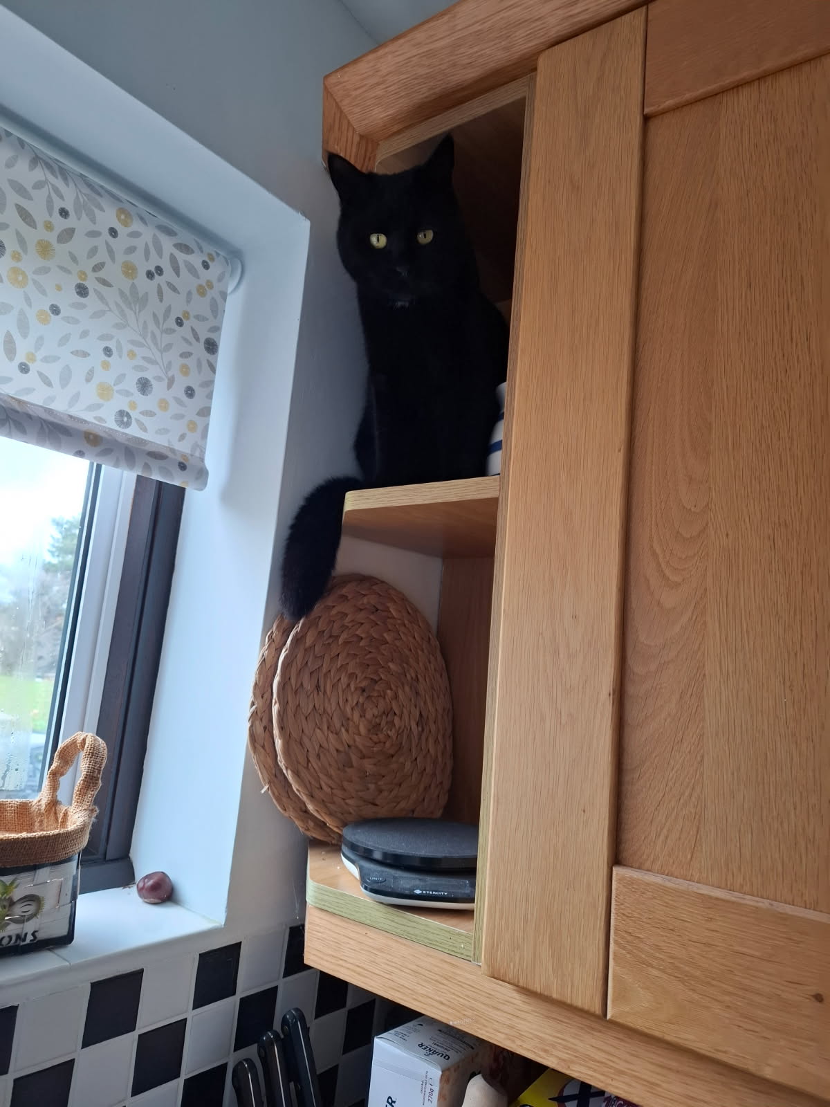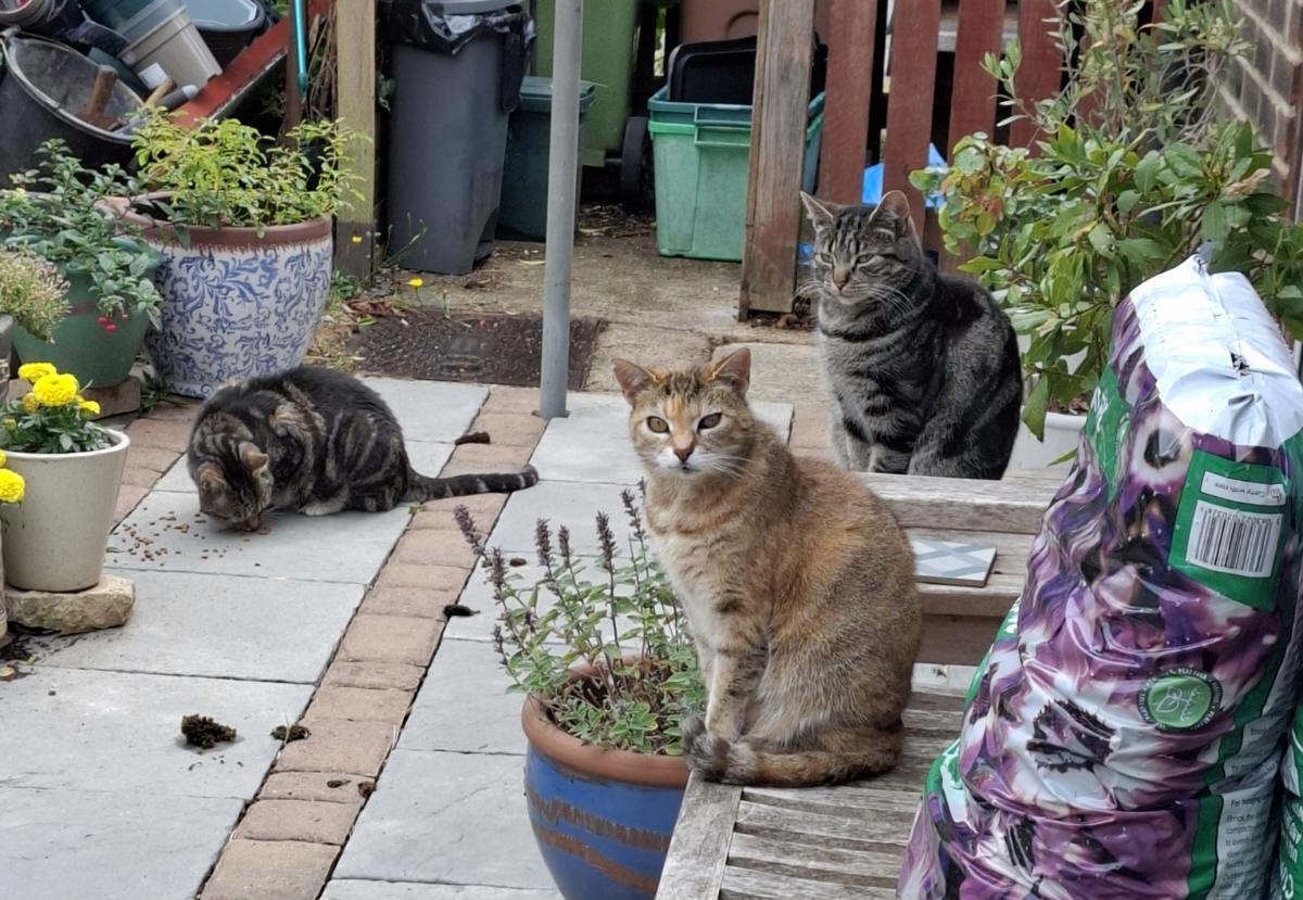Lily, the tabby on the table behind the bench. About 2, a stray, rescued a year ago, of the four cats, all with their individual personality, became my favourite. A month ago she was killed on the London Road. Before Lily died, my sister got asked to re-home Inky, about 1 1/2, whose owner was up at Sue Ryder, Leckhampton, dying of cancer. Five cats would be stretching it a bit, so she was looking for a suitable home. Then, just before he died and she went to collect Inky, Lily was killed. So Inky could stay with my sister. I did the standard service of dropping in on Inky while she was shut in for a few days, must be 3 weeks ago. Anyway she settled in well. She's currently in an orthopaedic hospital (for animals, presumably) in Swindon having her pelvis reattached and pinned, and possibly her tail amputated. One supposes she, too, was hit by a car. I've just been texted it's going to cost upward of 5 grand.