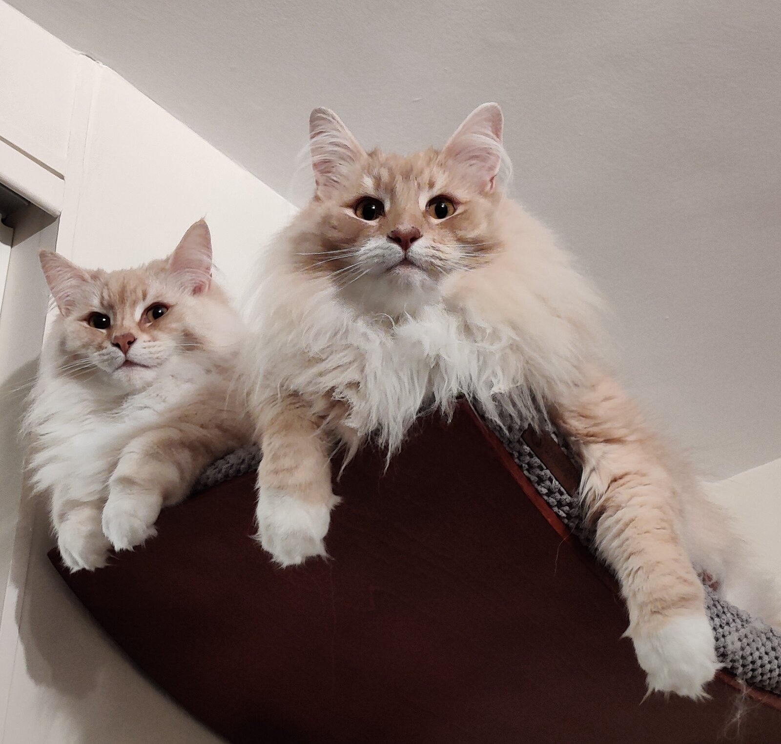 5. This is Lyra and Ragnar, both Norwegian forest cats. Lyra is pretty dainty for a Wegie. Ragnar is a bit of a unit at 8.5kg (he's not fat, he's big boned). They generally get called Sh*tmonkey and Nugget for what are probably obvious reasons :p on the plus side they blend in with my somewhat random interior decor colour scheme :D
