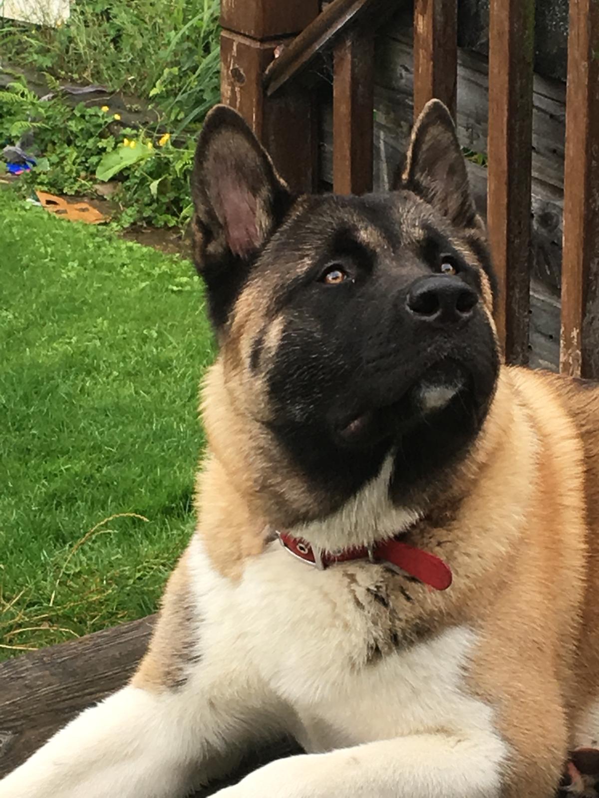 Tyson. He is 5.5 now. We have had him since he was 1.5 years old. Got him from a rescue centre that used to be in Bedford. Didn't go there to see him - went to see and Akita. The wife and I had 2 Huskies when we first got together. We lost Skye first then Storm followed a year later. That was about 7 years ago. The wife was due to have our third child very shortly after we lost Storm so decided to wait to get another dog. The wait turned to 3 years nearly. Anyway, my Dad is retired but did some voluntary work at the rescue home, walking the dogs, feeding etc. He phoned me one day as he knew we were looking and said they had an Akita in. We arrange to go and see him on a Saturday. However, when we got there they wouldn't let us see him as he had bit 2 volunteers. As we were walking back out Tyson caught our eye. We went to see him for 4 weekends in a row with the kids to make sure he was going to be for us. The rescue centre had no real info on him. They came in one morning and found him tied to their gate with a note saying he was living on a farm and didn't like cats so they had to get rid of him. After we got him and got his vaccination card I just about managed to read the address of the previous owner (they had scribbled though it). It came back as flat in central London. Anyway, he is fantastic round all three kids, literally couldn't wish for a better family pet.