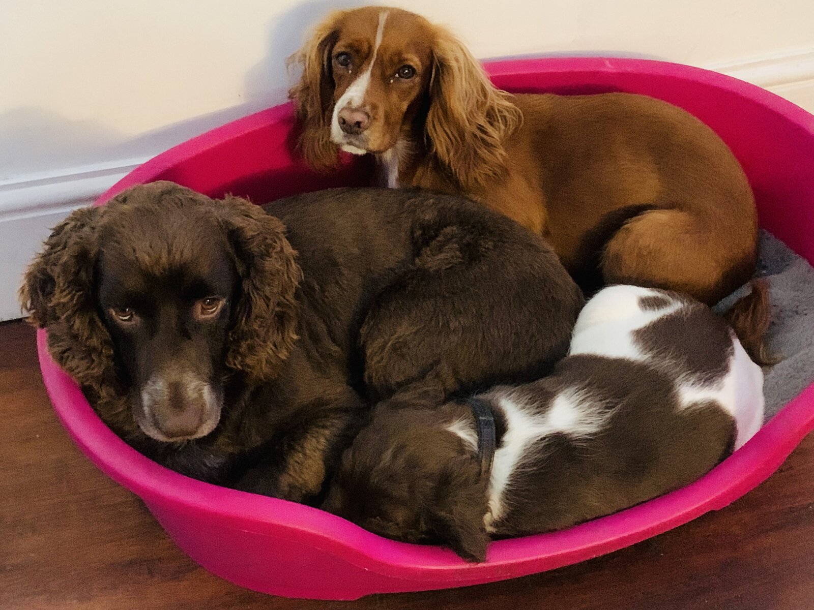 2 of our earlier pups. Our Gwen's boy 'Chas' and our Beth's girl 'Little Meg'. So, that's different parents/litters/ages. They're inseparable. It's a fluke that they look so similar and live with the same couple.