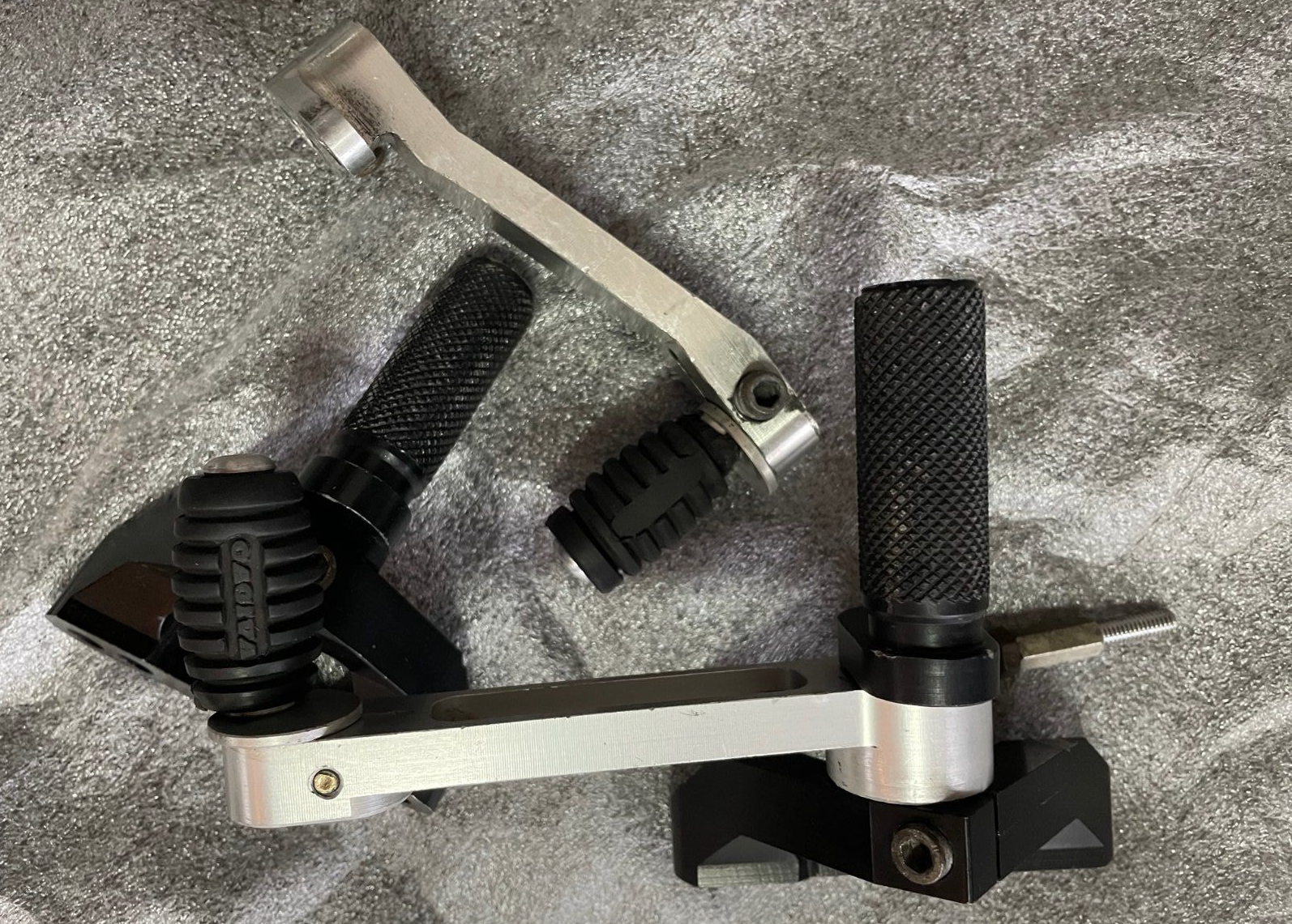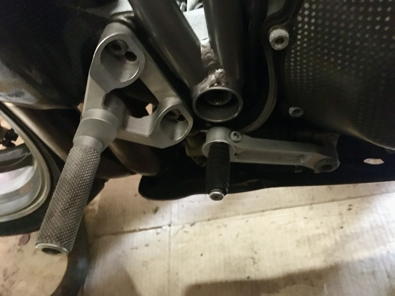 Your gearshift lever is mounted on the rearset, it appears to be a single bolt which secures the lever to the foot peg mount to the frame. Mine is mounted beneath and to the rear of the foot peg mount thus reducing the distance between footpeg and gear lever rubber. Perhaps explains why I found it so difficult to get my toe in to change up gear when I first rode it. I’ll be playing around with the positions anyhow.