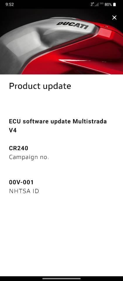 From a forum: Update to the CR240 software change: According to my local dealer (Ducati Omaha), it contains: Following continuous quality checks on the vehicle concerned, we would like to inform you that a new engine control calibration update has been released with purposes related to ensuring better product reliability and improving the user experience, specifically: Changes some diagnostic strategies Improves throttle closing strategy after Key OFF Improves the refresh rate of the engaged gear indication displayed on the dashboard and the rev limiter