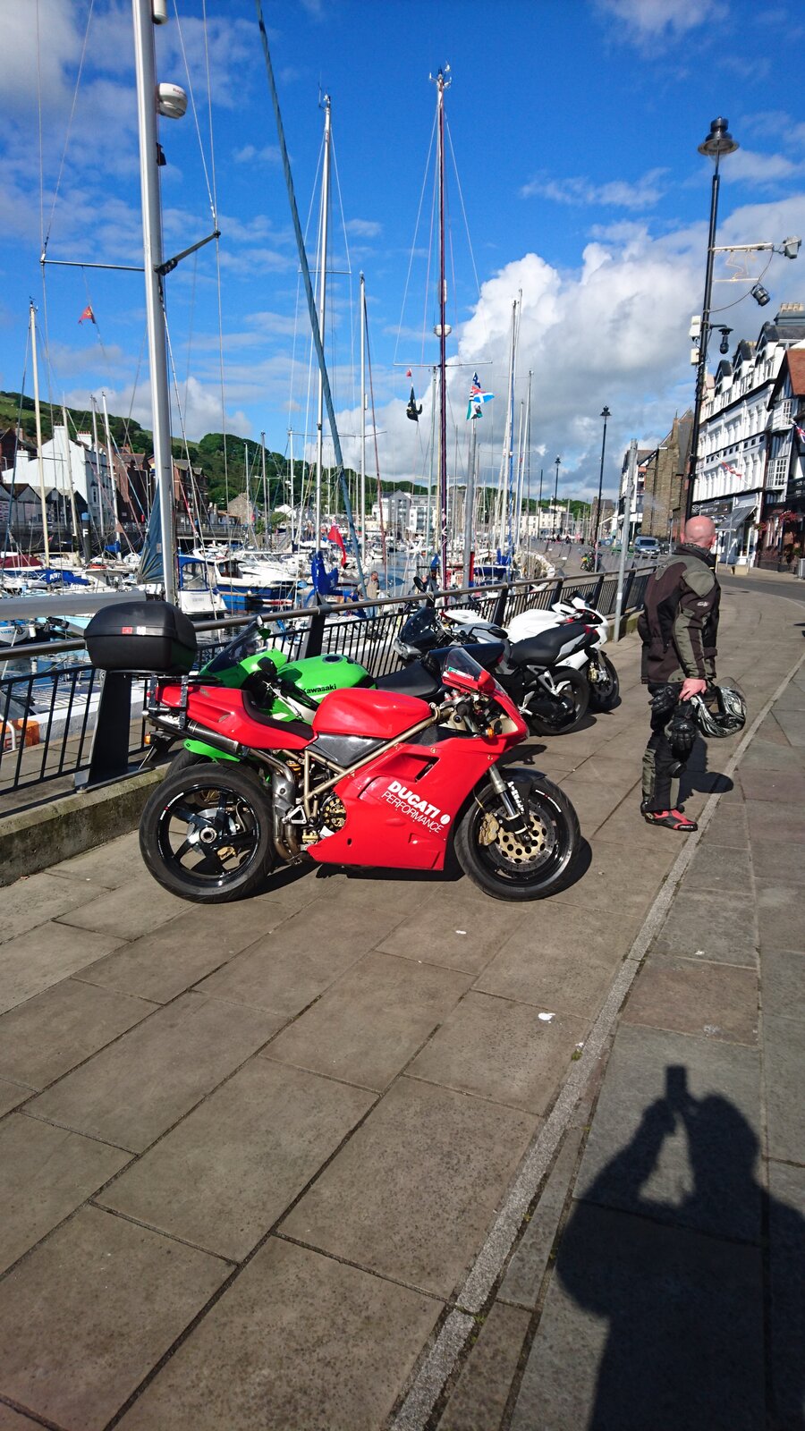 6'0", 77 kgs here. I read all about the reviews on 916 comfort being similar to "a torture rack" and the seat so hard "it's like straddling a park bench". Sure the original seats are firm, but I found riding a 916 on an extended ride for the first time was fine- I think out-of-shape journos gave it a rep that is probably untrue. The fact that you can lope it around town, and have the only inconvenience be heated calves & butt speaks volumes as to how well the ergos were designed. Tamburini was a rider, let's not forget.... he rode several 916 prototypes until he was satisfied and production could begin. If you find sport bikes uncomfortable, get fit.... don't blame the bike.