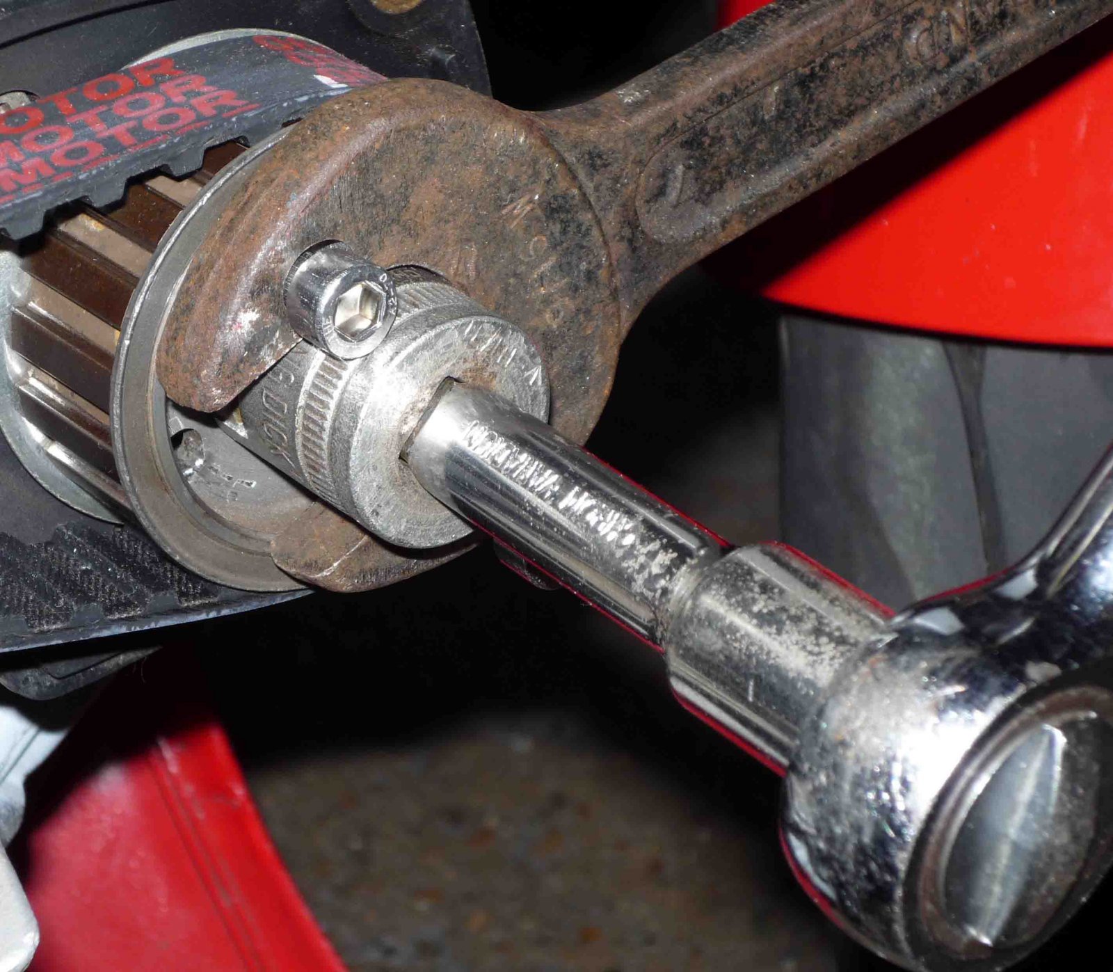 I used a POR15 kit from Frost auto restorations. It's not cheap, but contains everything you need. My tank wasn't in as bad as some, but prevention is better than cure etc. Don't be tempted to skimp on the 3 stage POR15 process and just coat the tank with sealer, or Petseal or similar, because without the proper keying and degreasing chemicals, the sealant will just flake off. I had this with a car tank I worked on ages ago. My cam pulley tool looks something like this:- DUCATI PANTAH MOTORCYCLE CAMSHAFT PULLEY REMOVAL TOOL | eBay The trouble with using a socket or a filed up nut, is that you are always going to have a little difficulty holding the pulley still while you undo it. Sometimes using an old scrap belt with a pair of mole grips or similar won't be enough, and you will have to drill the pulley nut. This happens if you use locktite or similar on the pulley nut. After screwing around with Ducati engines for about 10 years, I gave in and bought the tool. I think that it's worth it. Two of my mates also have Ducatis, so it gets some use. The camshaft seals behind the pulley need changing every now and again, and this tool comes in handy for that.