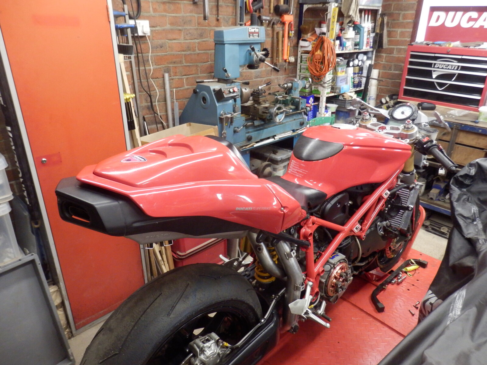 Whilst I wait for the Wing mirror to fully cure I've been pondering what to do about a rear end. I now have several options. The decision isn't helped by not knowing which exhaust I'll end up using. The standard one which I've gutted, or a Racefit one I've picked up that needs a load of work. Firstly the 'R' style Carbon tailpiece previously mentioned in this thread: It basically owes me next to nothing, and I've now modified it to fit with the standard Biposto subframe. It fits over the standard Exhaust and exhaust cover. But needs a lot of work cosmetically and I'm not sure I like the shape. Secondly is an RS style Carbon tailpiece I've picked up for next to nothing because again it needs work. https://www.ducatiforum.co.uk/threads/carbon-tail.89428/ It looks daft over the standard exhaust, but fits nicely over the Racefit. Note above it's mocked up only as I'd need to cut and shut a Biposto Subframe to mimic a Monoposto as it won't fit with the Biposto subframe in place. The other option is the standard rear panels with an aftermarket single seal 'converter' which fits with both the standard and racefit exhausts: The 'Converter' needs paint to be good enough to use, and I'd cover the solid plastic Bum Pad in soft Vinyl to mimic a proper one. Going this route would give me the option to convert to Biposto really quickly should I see the need, and gives a small key accessible locker for tools. I must admit I'm quite liking the proportions, look, and practicality of the last option at the moment, but could be swayed by the Carbon RS one if I go with the Racefit exhaust. I'm almost certain to sell on the Carbon 'R' One at the moment to add to the project funds pot.