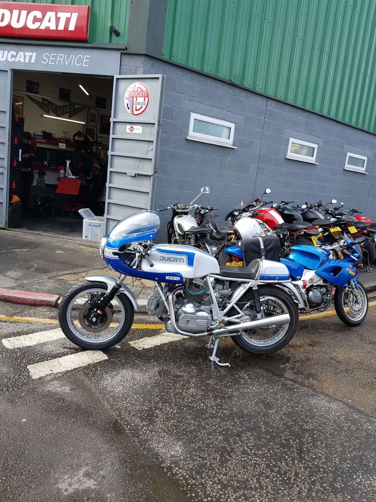 13. Ray Petty Meccanica, North Greenwich. Refurbished 1976 900SS bevel being collected today. Note also the Yamaha-Belgarda SZR 700 single just behind, and the Norton Model 7.