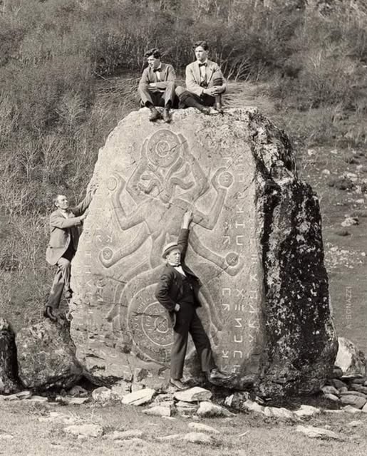 Tourists climbing over a statue to an ancient Winston Churchill?
