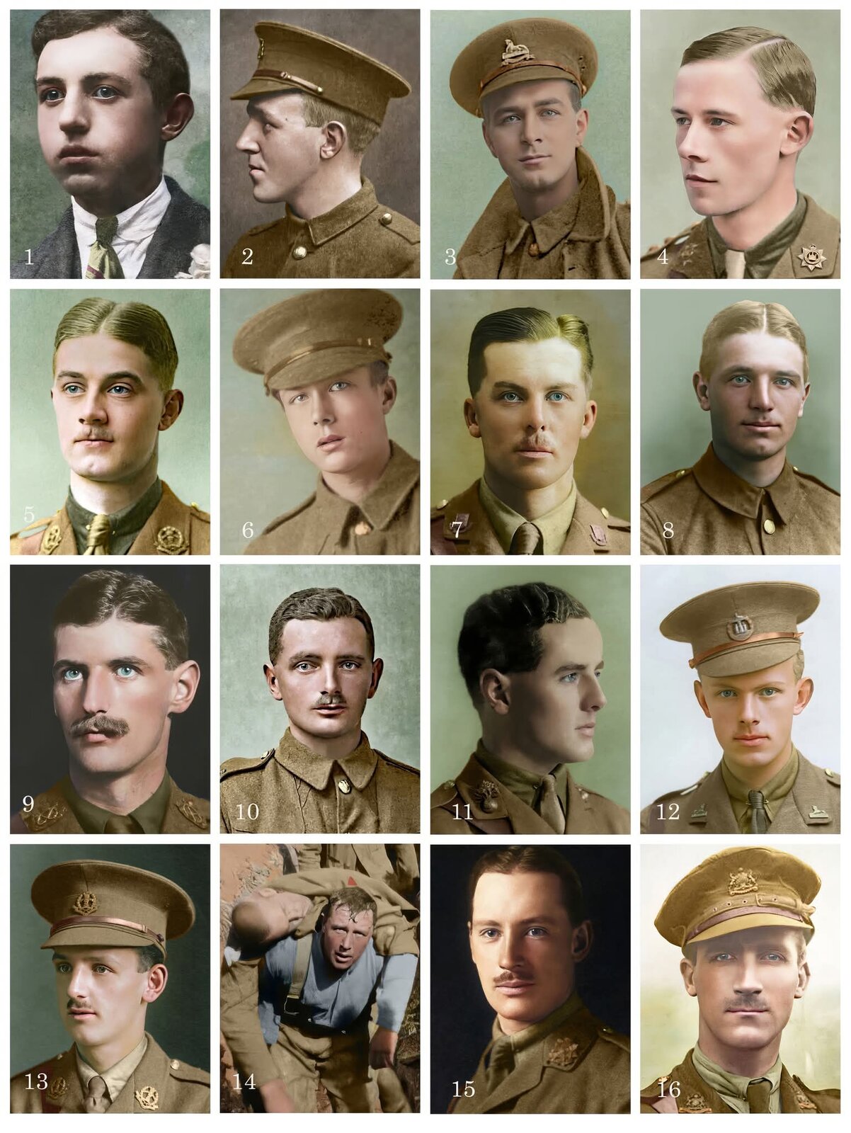 Killed or mortally wounded on 1st July 1916 - First day of the Battle of the Somme. On that day British and Commonwealth casualties totalled 57,470. Of that number 19,240 were killed and 2,152 missing or captured. This photo collage shows some of the faces behind those awful statistics. 1 Private Thomas Chambers, 9th Battalion Royal Irish Fusiliers, 17 years old. 2 Private William McFadzean VC, 14th Battalion Royal Irish Rifles, 20 Years old. 3 Serjeant Frederick Ashton, 10th Battalion Lincolnshire Regiment. 4 Lieutenant William Hodgson MC, 9th Battalion Devonshire Regiment, 23 Years old. 5 Second Lieutenant Eric Heaton, 16th Battalion Middlesex Regiment, 20 Years old. 6 Private Horace Iles, 15th Battalion West Yorkshire Regiment, 16 Years old. 7 Second Lieutenant Gilbert Waterhouse, 2nd Battalion Essex Regiment, 33 Years old. 8 Private Frank Skinner, 11th Battalion Suffolk Regiment, 21 Years old. 9 Captain John Green VC, R.A.M.C, 26 Years old. 10 Second Lieutenant Henry Cowin, 21st Battalion Manchester Regiment, 31 Years old. 11 Lieutenant Wilfred Nield, 11th Battalion Royal Fusiliers, 25 Years old. 12 Captain William Green, 1st Battalion Dorsetshire Regiment, (Mortally wounded on 1st July and died on 6th July). 21 Years old. 13 Second Lieutenant Ronald Grundy, 2nd Battalion Middlesex Regiment, 19 Years old. 14 Unknown soldier from 29th Division being carried along a trench. This man had just been recovered from No Mans Land but died shortly after the image was captured. 15 Captain Raymond Smith, 11th Battalion Border Regiment, 27 Years old. 16 Captain Charles May, 22nd Battalion Manchester Regiment, 27 Years old.