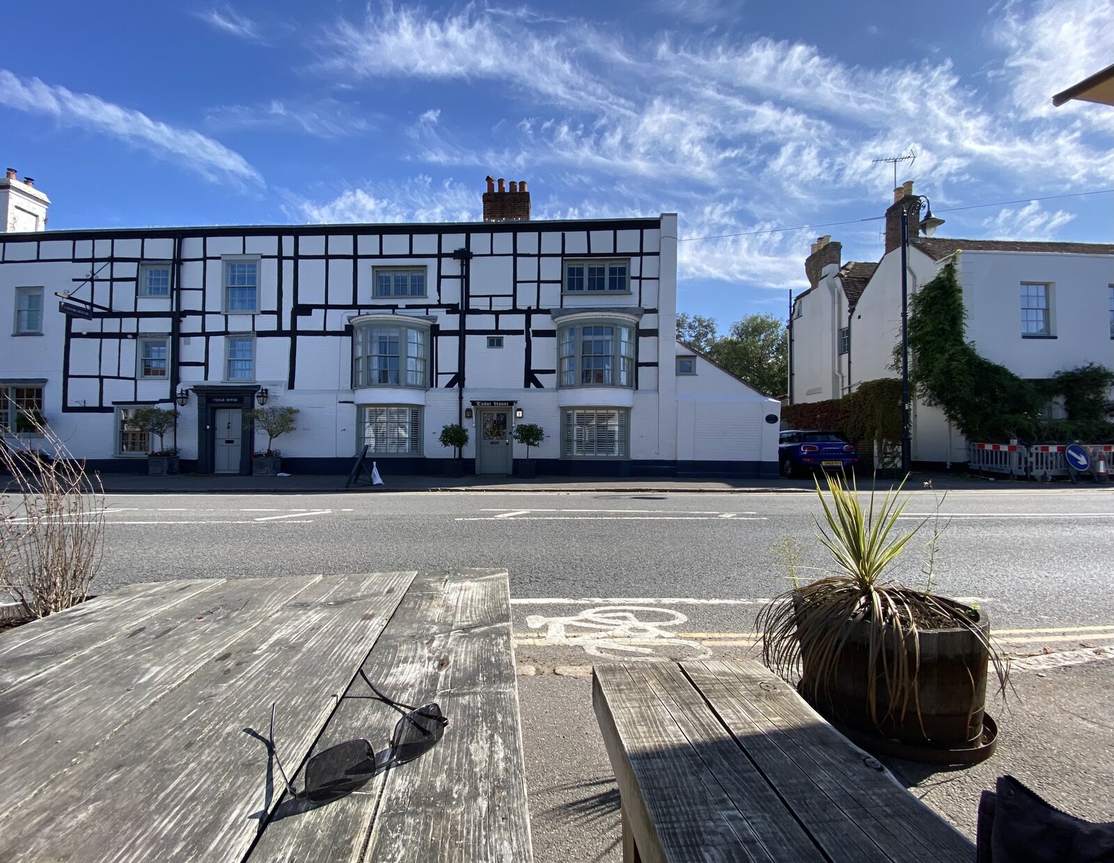 It looks like the gardener's on holiday viewing those pots, Clapton / Weller land.