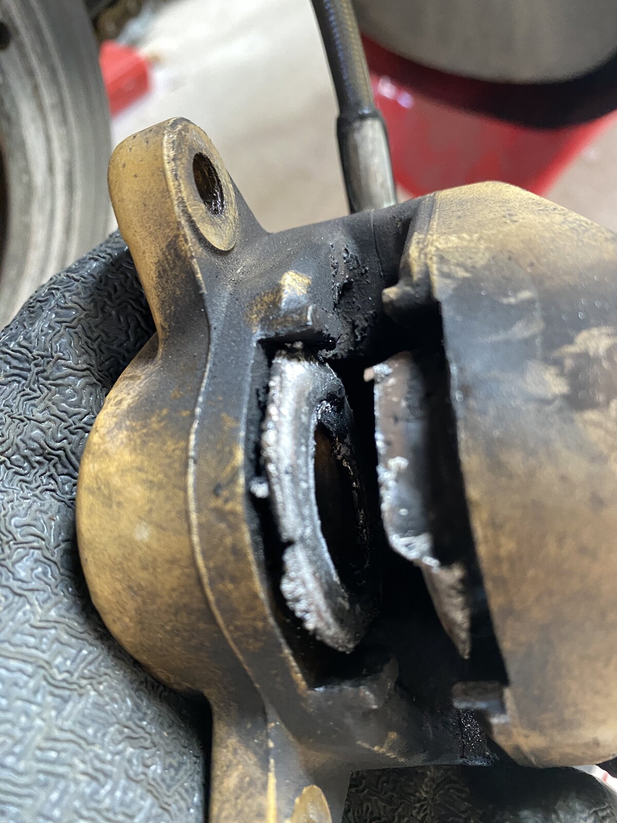 On my way into Worcester today, bike seemed a bit strange, saw smoke in the mirrors. Pulled over, caliper was basically on fire. Once I got the bike home and pulled it apart this is what is left of the pads - two bent up pieces of metal. The pistons are toast also. I can’t find any rebuild kits on eBay but after the heat it experienced I’m thinking just to get another caliper. There’s a couple on eBay, but does anyone have a spare they can sell me?