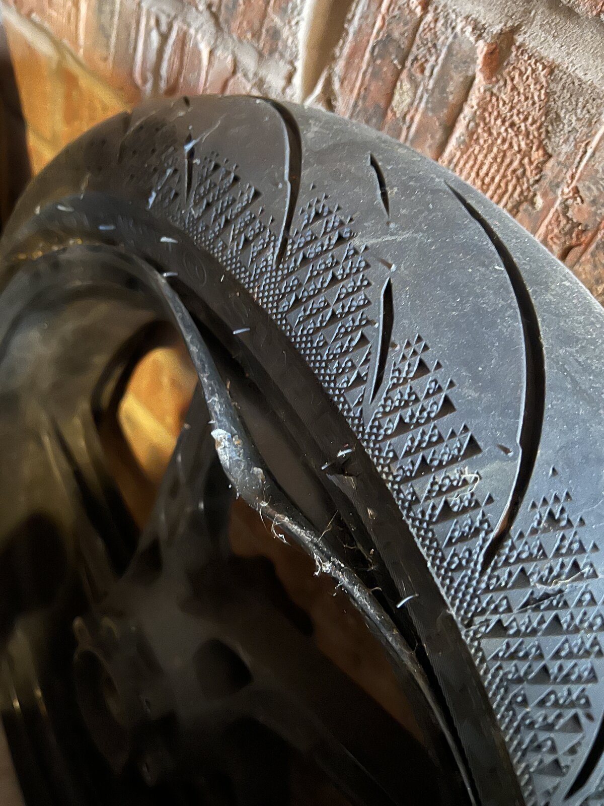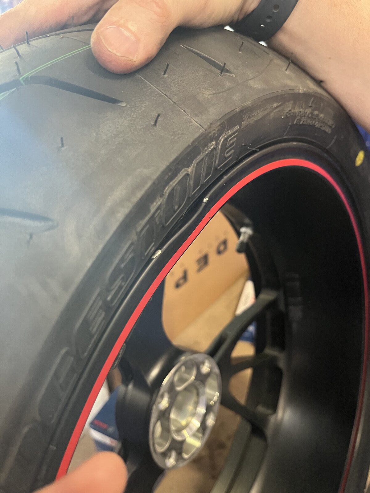 Interesting thread. I have the same on the original 999 front - which I didn't notice until after the spill (that twisted the forks). I simply do not see how the way I came off could have done that - or, really, by anything but a tyre lever. The implication being that it was done at the then-recent tyre replacement and I didn't notice it, not looking with more than a glance, trusting the place implicitly - and that they did it and wheeled the bike out to me with their fingers crossed behind their backs. Obviously by the time I saw it it was too late; even going to court would probably fail. So I bought Duke of Stow's Ducati Performance pair - in black, which I prefer; won't go there again - who I won't name for the same reason I won't even try to take them to task; and won't make that mistake again.