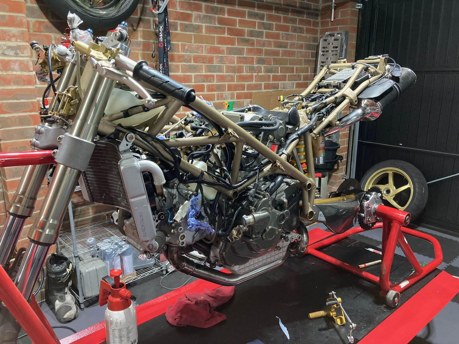 Slow progress really with holidays and some personal stuff…. Lots of cleaning plus, suspension at FTR for a service, bodywork painting started, headstock stripped, calipers back together. waiting for a few bits and then it will be putting it all back together